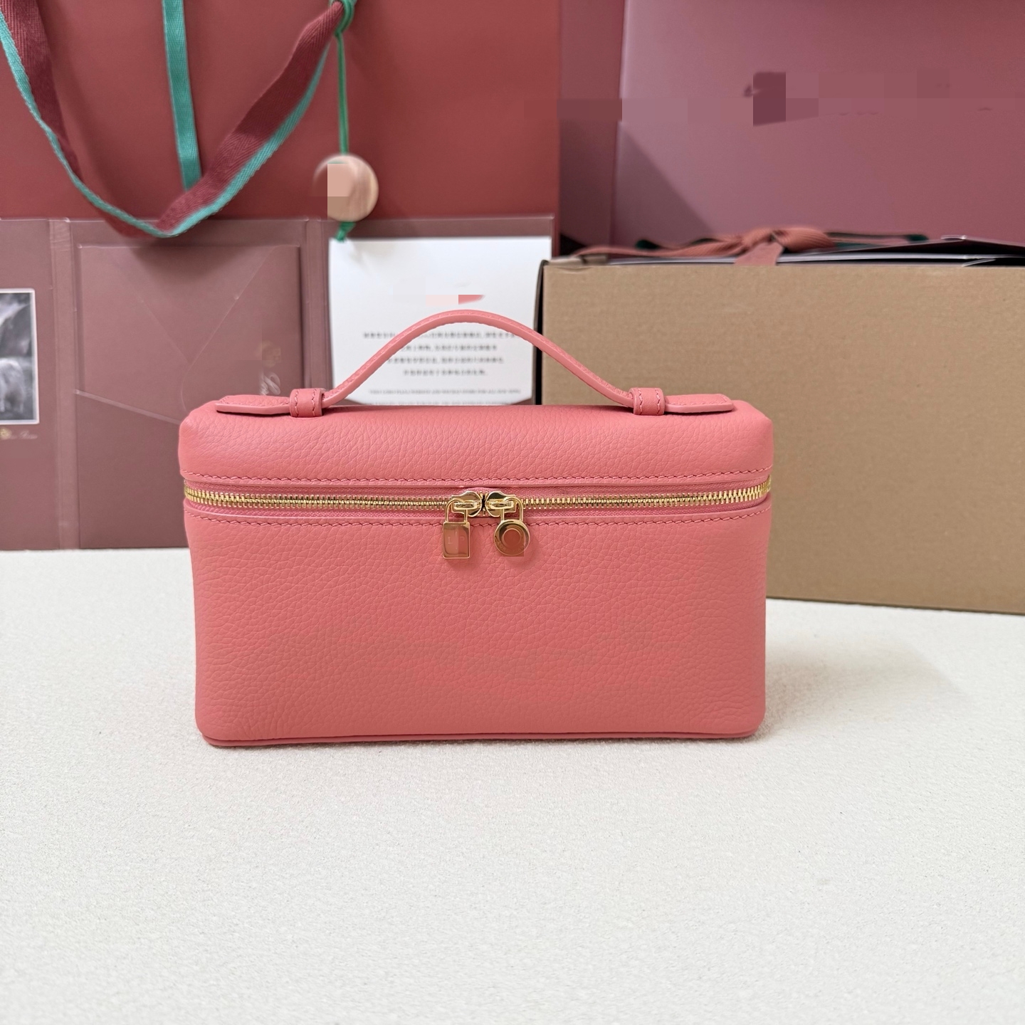LP19 泡泡粉 飯盒包 寬開口小袋採用如黃油般柔軟的小牛皮打造。隨附可拆卸肩帶,可打造出百搭迷你包袋。高度:11釐米寬度:19釐米深度:6.5釐米