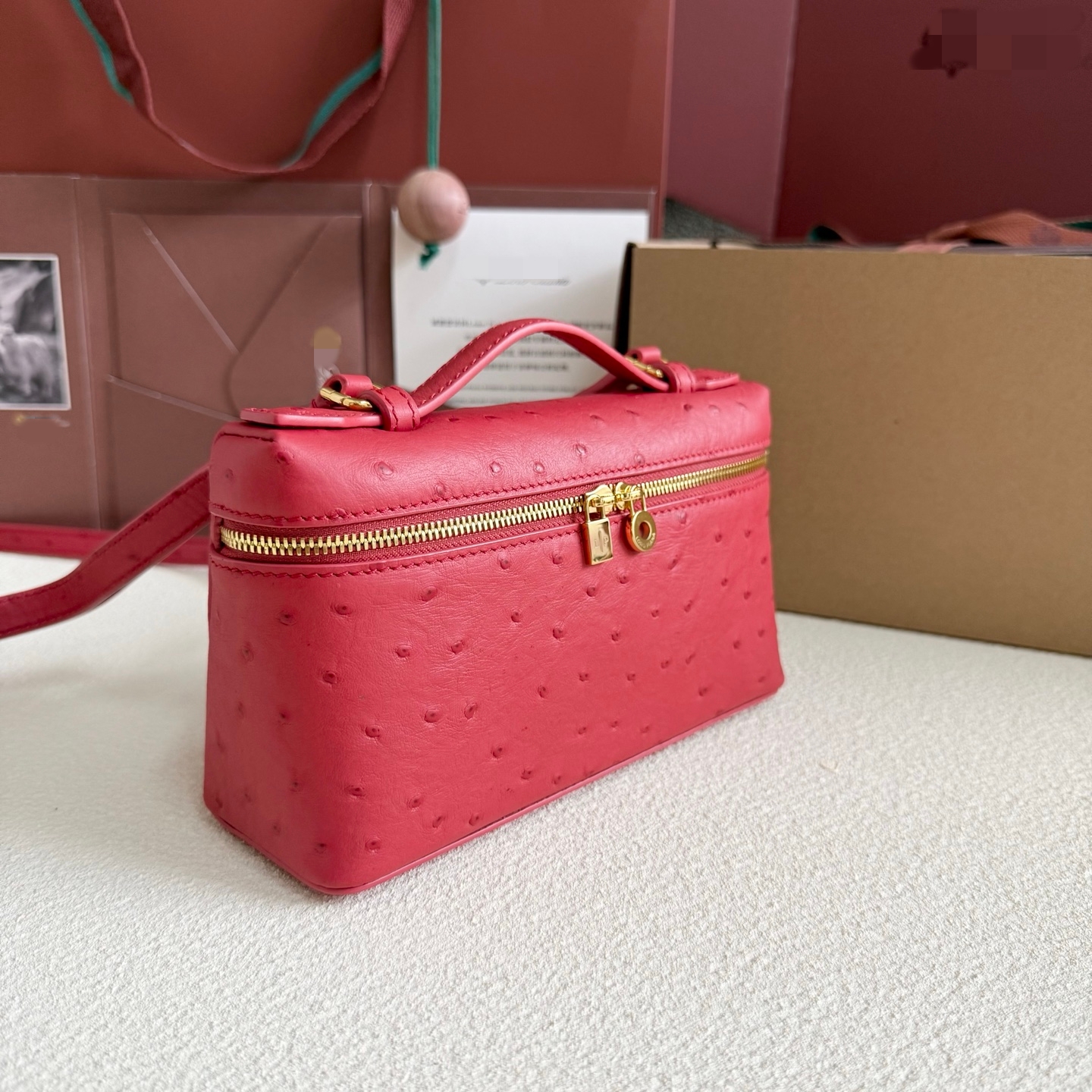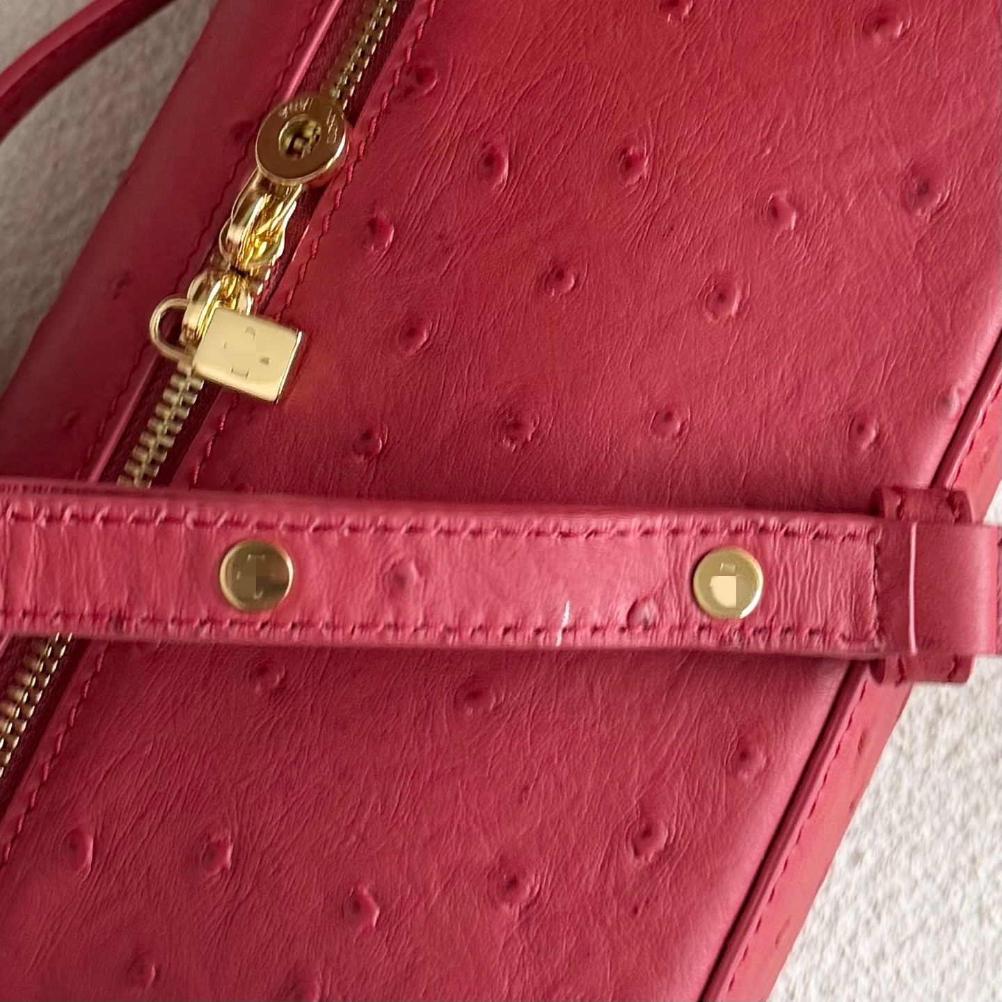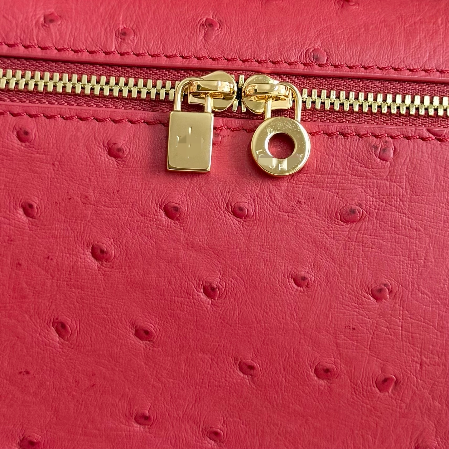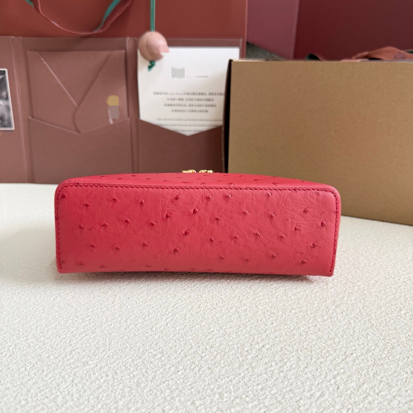 LP19 火紅色鴕鳥紋 飯盒包 金扣 貨號:FAN1034 顏色:火紅色鴕鳥紋 這款寬口手拿包採用珍貴的鴕鳥皮製作,數道手工匠藝使皮革呈現出光滑且別致的紋理。搭配膠帶的小巧設計造就實用百搭特色,是日常打造動感氣質的理想選擇。 尺寸:19✖️11✖️6.5cm 雙向拉鍊開合,拉鍊頭點綴My Charms 墜飾 主體:鴕鳥皮 內裡:小羊皮