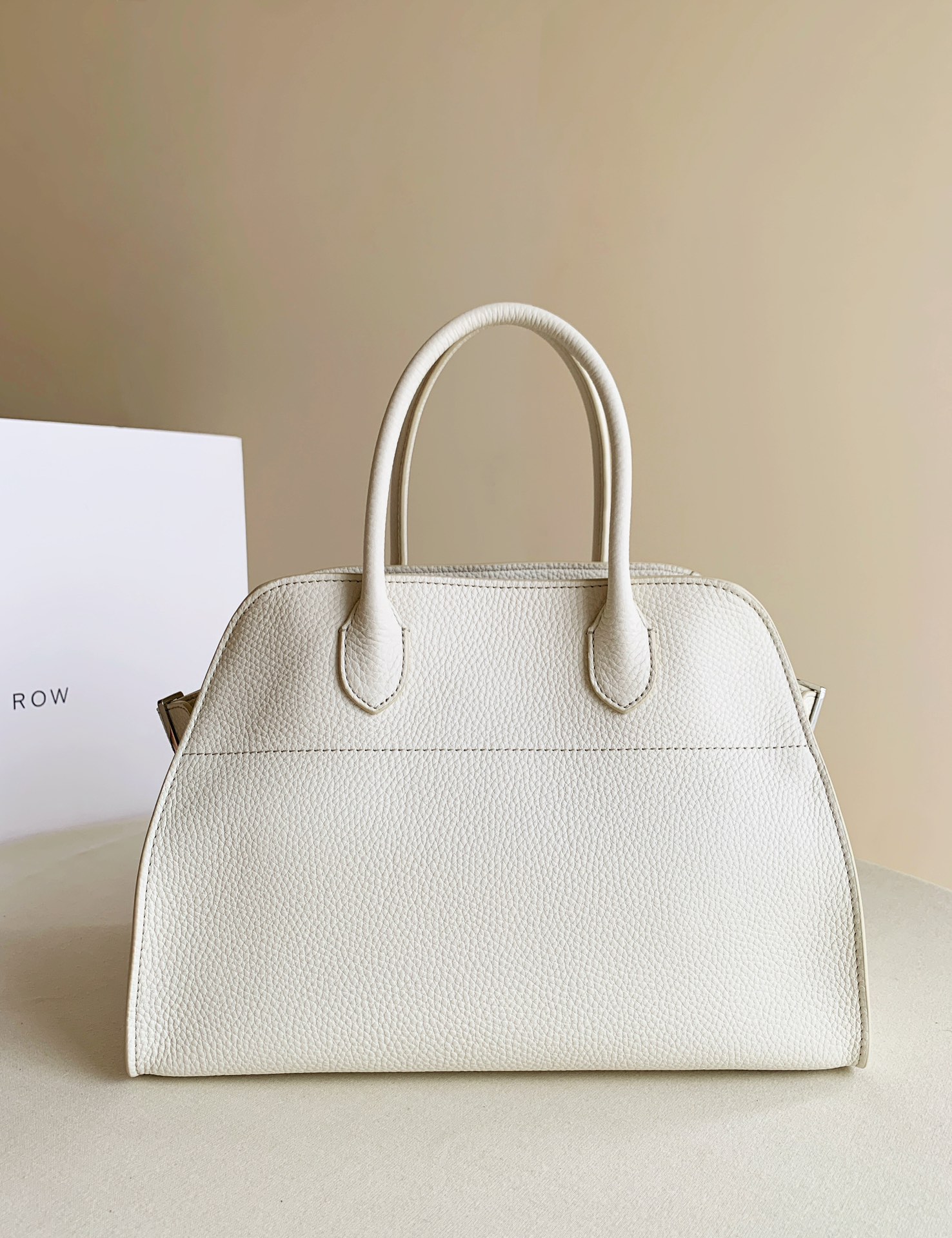Row Margaux12 中號 荔枝紋 白色 ,一向比較低調內斂,鮮為人知,雖然馬鞍皮非常火,但這次我選擇站荔枝皮! 🐮啞光荔枝紋牛皮 —— 相比馬鞍皮金扣,荔枝皮搭配的是銀扣,整體低調耐人尋味,更加年輕沉穩,尤其是啞光的皮料,更有那種靜奢老錢風的皮質;荔枝皮的優點也很明顯,耐造耐磨,隨手一扔也毫不心疼~不像馬鞍皮容易有刮痕。