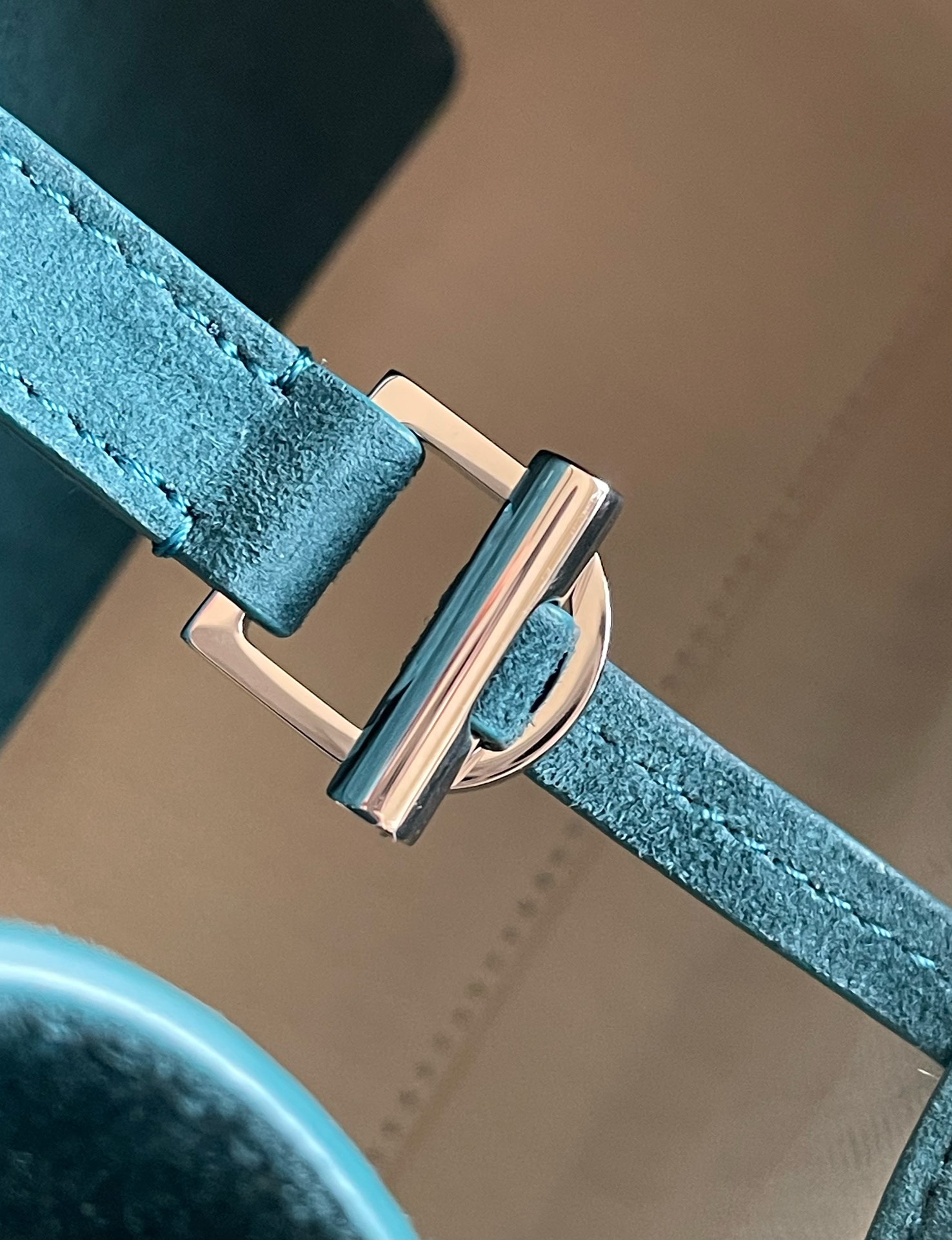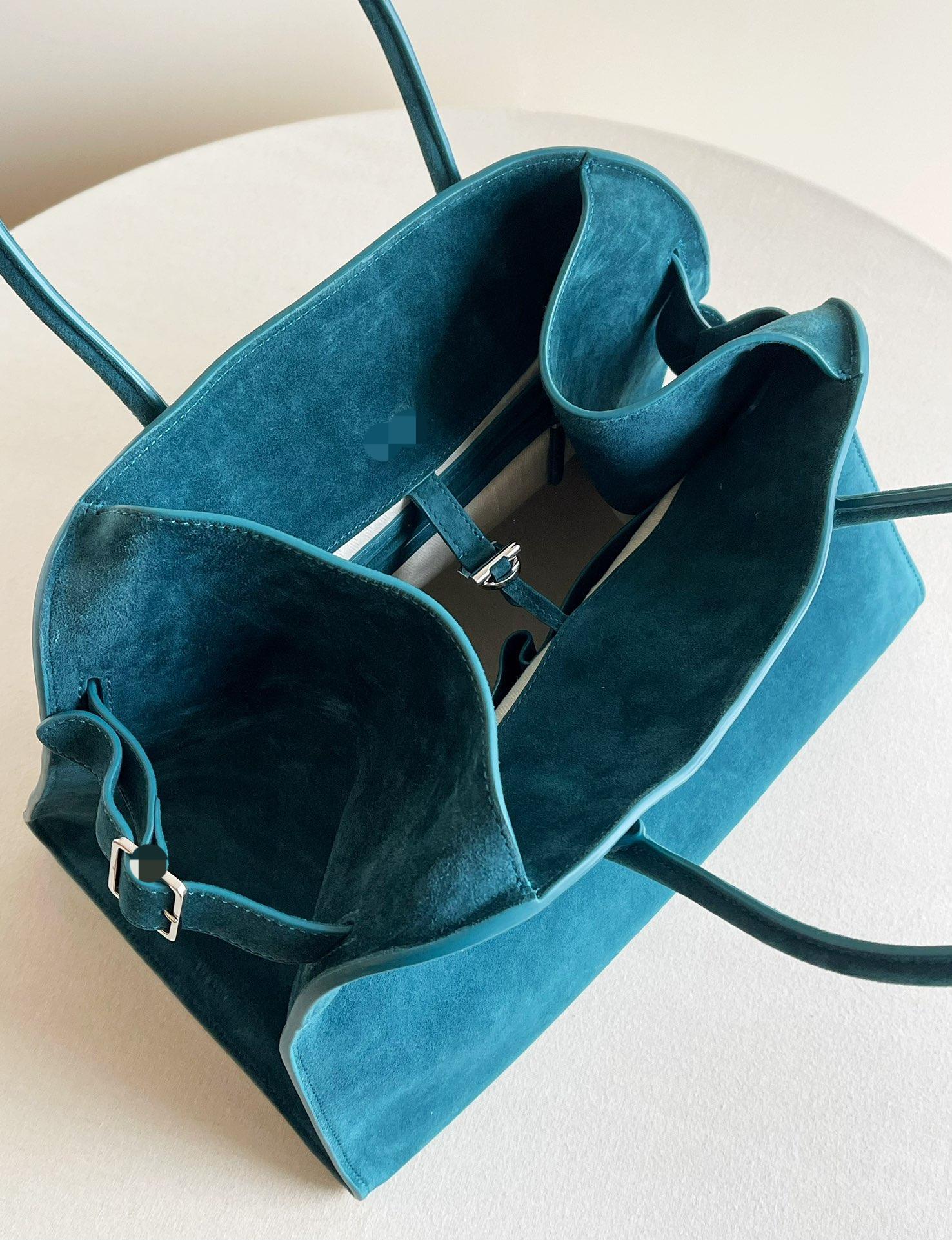 Row Margaux12 中號麂皮孔雀藍 簡約的款式+獨特復古的顏色,簡直就是絕絕子這個顏色搭配深色系或全身黑色的職業裝簡直就是點睛之筆! 包包整體結構走線俐落,簡約的五金幾乎找不到的logo,這就是therow的設計風格,非常有腔調!如果想選一款容量大又低調質感又好的包包