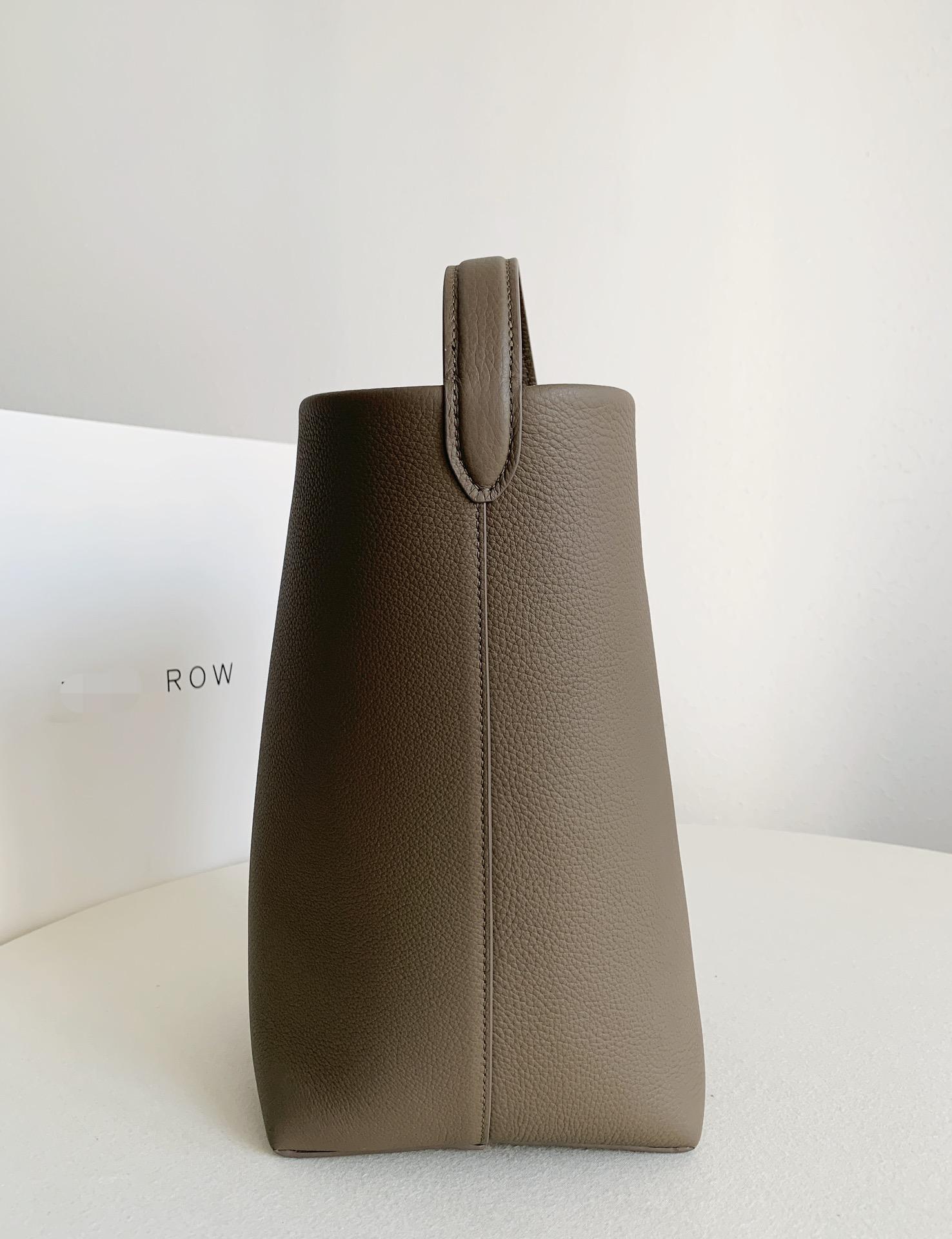Row Park Tote smoked taupe 水桶中號新顏色smoked taupe烟灰 parktote的皮料難度在自然摔的程度,“站成水桶,躺成棉被”是一個隱性的尺規;自然摔紋的皮質就算污漬沾染也容易清理;沒有五金的包款更加考驗皮料基礎,肉感和桶狀的維持需要好的皮料去支撐;油邊的難度不如麂皮水桶,但也要慢工才能光滑不顯廉價感,手柄的托料要有分量不是軟如織帶;自然摔紋牛皮紋路每只都不一樣,不需在意對比其它,因為自己上身的是獨一