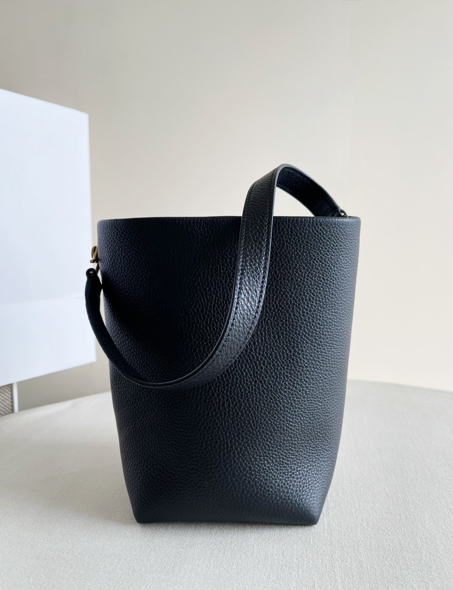 Row Park Tote 小號金屬金扣黑色水桶包 極簡風,沒有任何品牌標記,甚至logo是黑色的,淺淺刻在在內裏的絨毛皮上。新加的旋轉金扣五金元素,五金質感的盡頭就是貴金屬,鍍厚金工藝,表層濛濛一層起霧,同步所有大品牌的工藝,五金沒有貴金屬的襯托,品質都不能叫頂級。