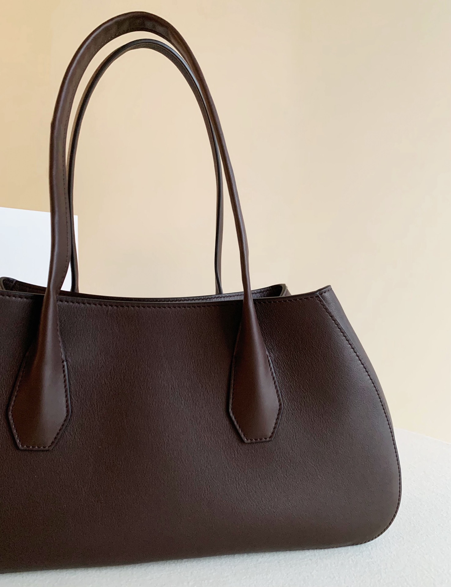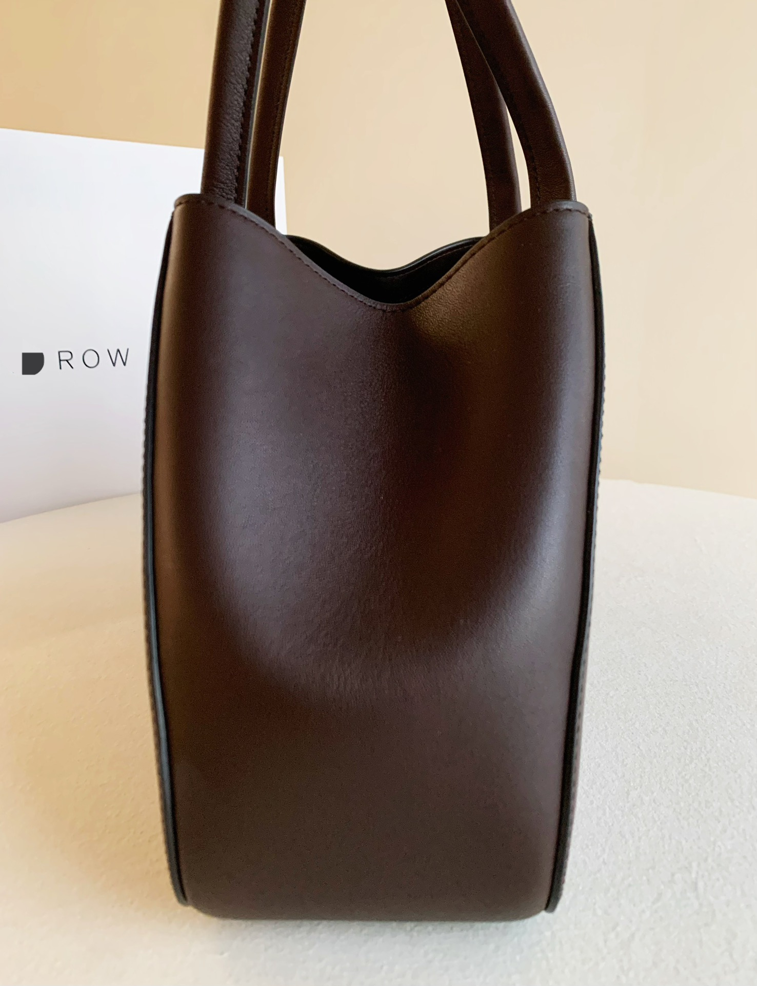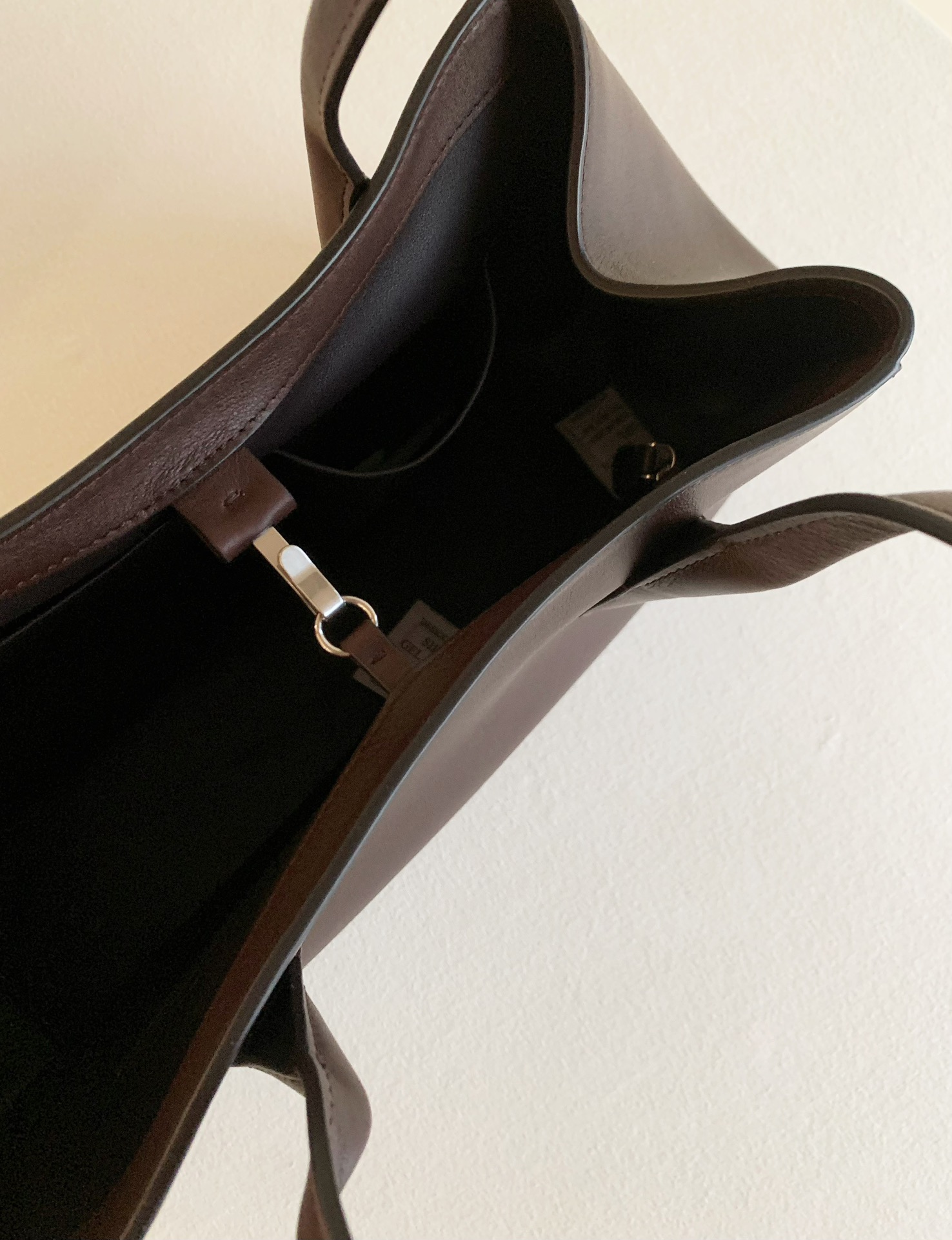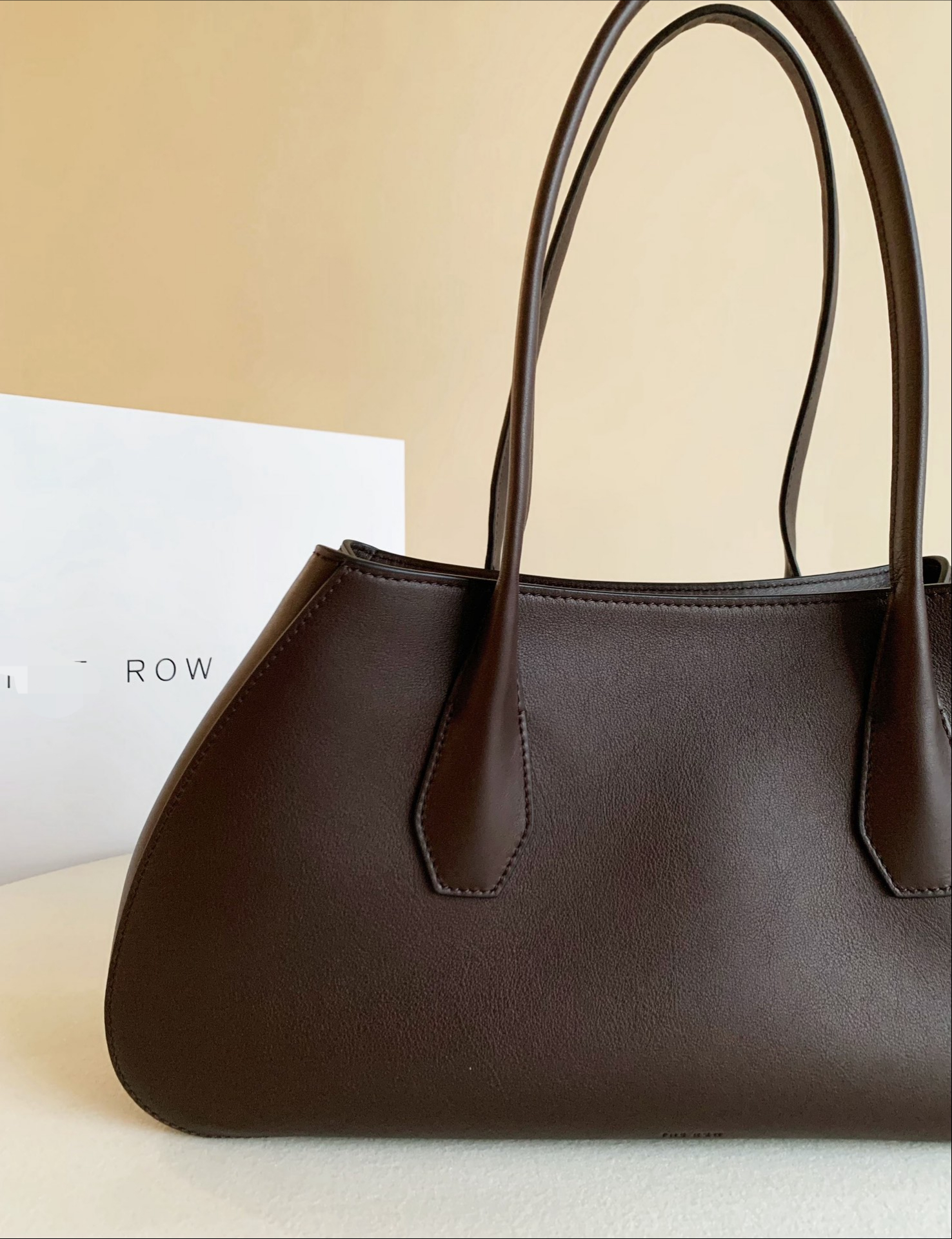 Row Alger 馬鞍皮 深棕肩包,Alger繼承了Row一貫的簡約與精緻,強調實用性與優雅的結合。 📐Alger是一隻“幾何感梯形”的肩包:平直的包底、略收的側翼與順勢延出的管狀肩帶,構成一個既有雕塑性又可日常承載的輪廓。 🤎用料上,Alger選擇了紋理小牛皮和光面牛皮作表層,並配以羔羊皮內襯,觸感與光澤被處理得近乎克制——既保留了皮質的自然紋理,也保證了包型的挺括與耐用。手工縫製與精細的把件連接,强化了物件的耐看與長期