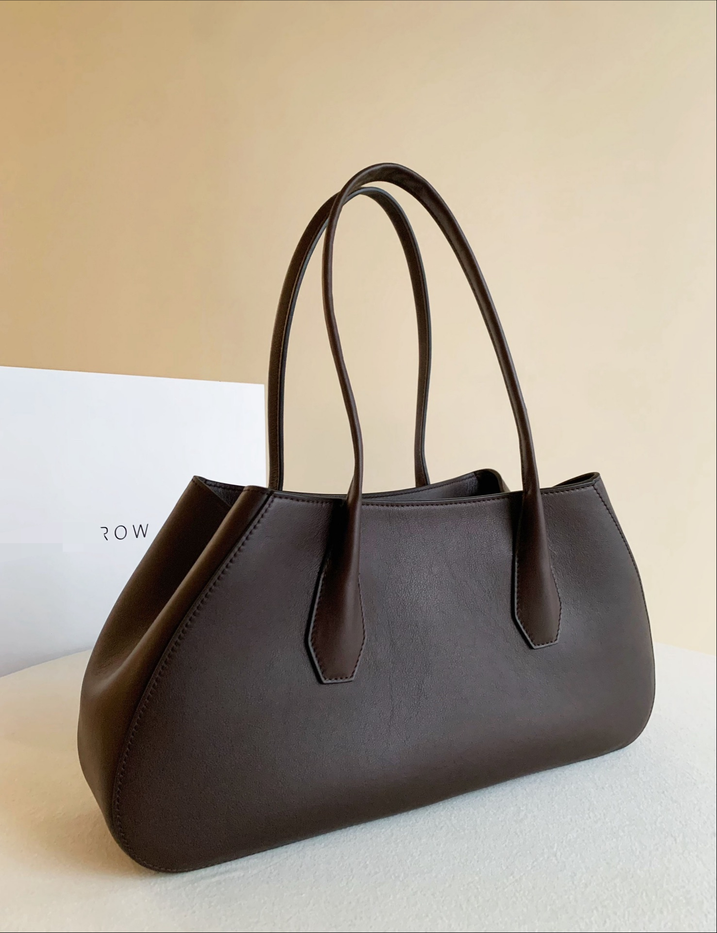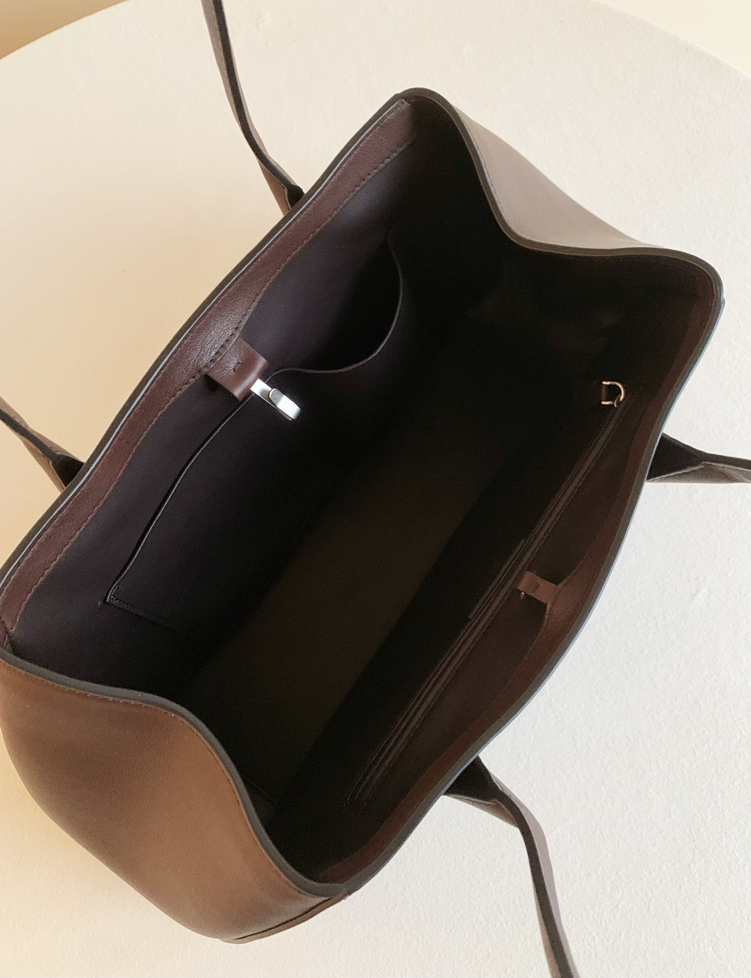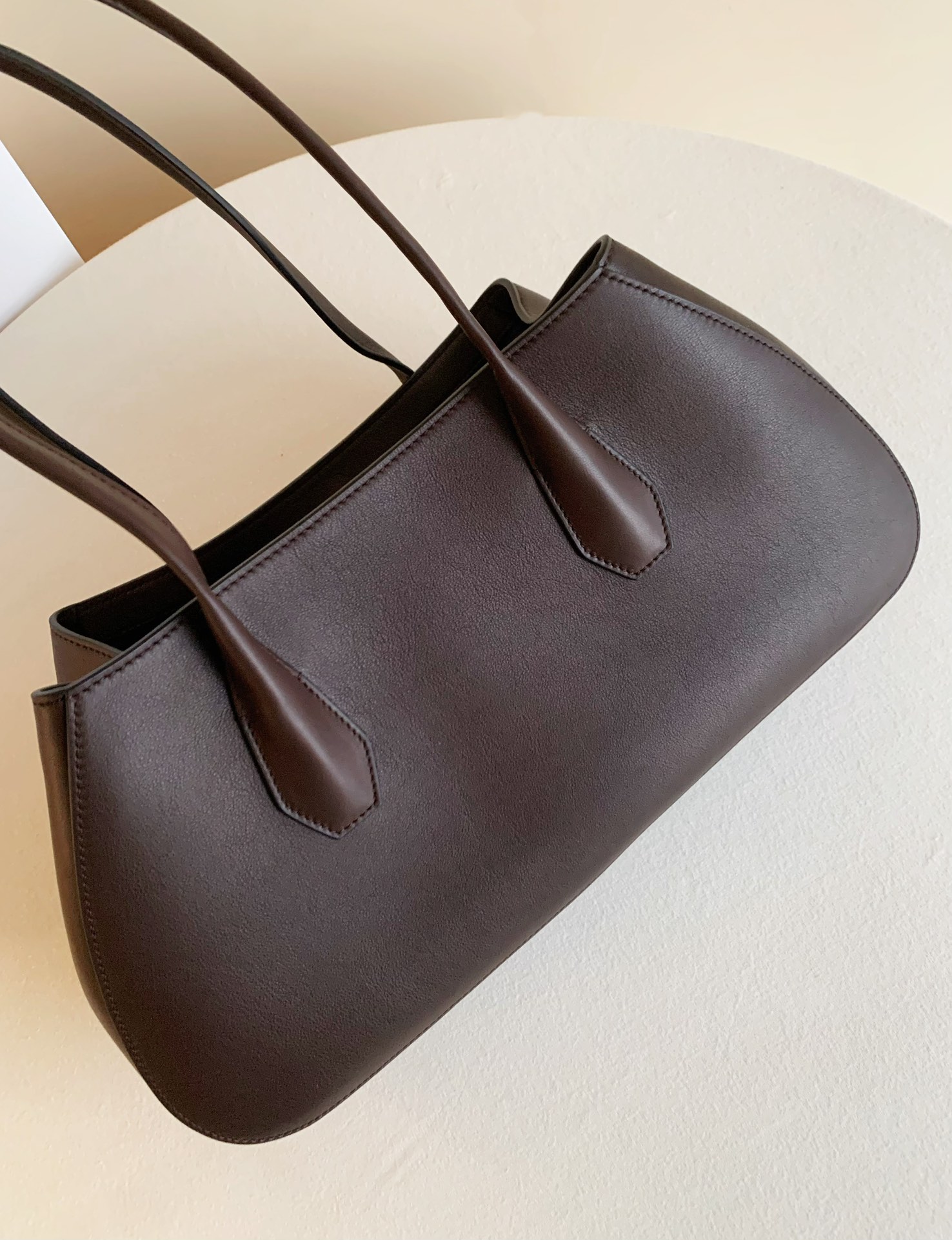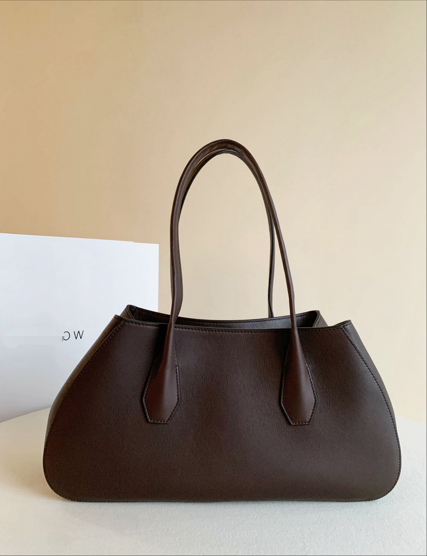Row Alger 馬鞍皮 深棕肩包,Alger繼承了Row一貫的簡約與精緻,強調實用性與優雅的結合。 📐Alger是一隻“幾何感梯形”的肩包:平直的包底、略收的側翼與順勢延出的管狀肩帶,構成一個既有雕塑性又可日常承載的輪廓。 🤎用料上,Alger選擇了紋理小牛皮和光面牛皮作表層,並配以羔羊皮內襯,觸感與光澤被處理得近乎克制——既保留了皮質的自然紋理,也保證了包型的挺括與耐用。手工縫製與精細的把件連接,强化了物件的耐看與長期