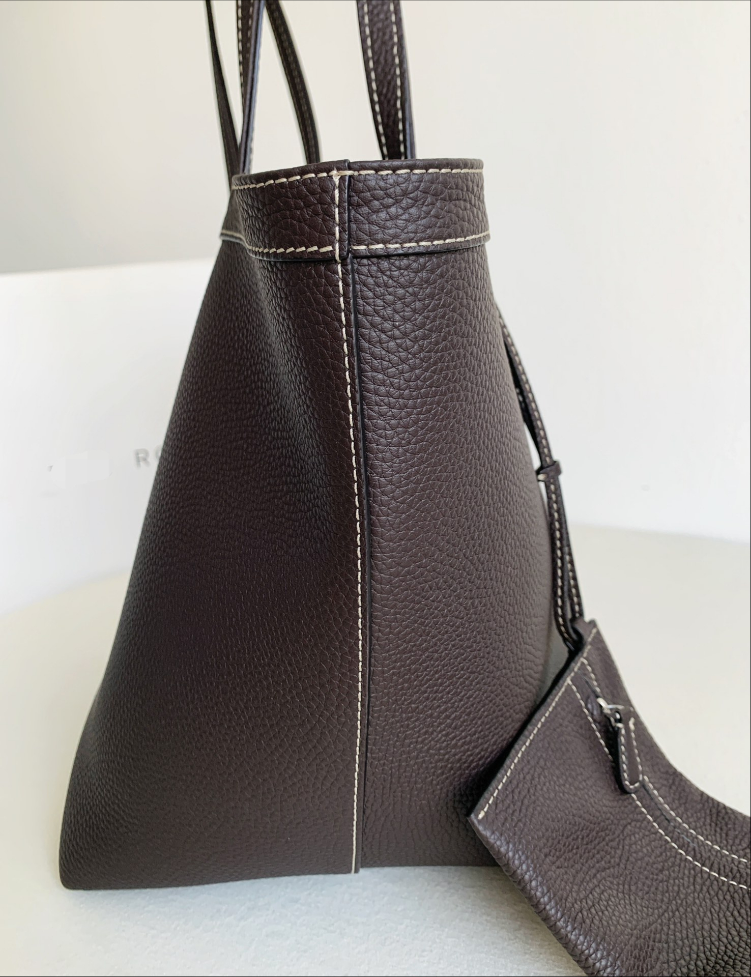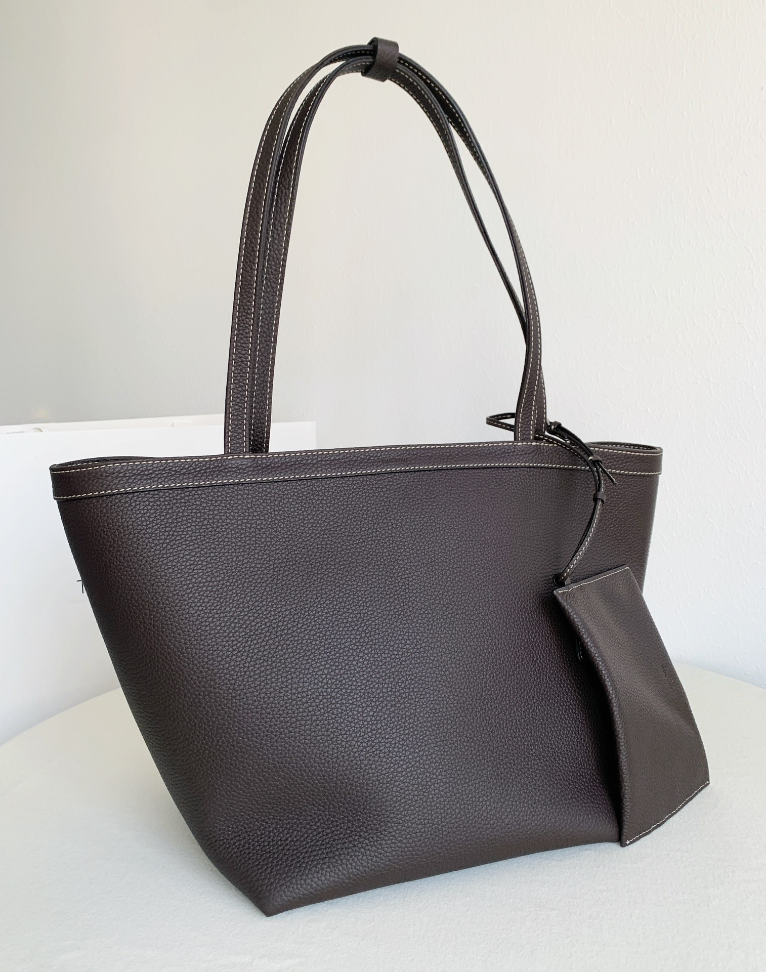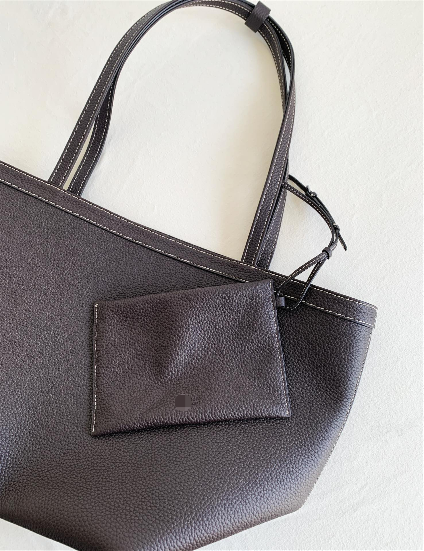 Row Tote Stitch 大號 棕色 外皮採用頭層荔枝紋TC牛皮製作,內裡搭配羊皮。 擁有比較飽滿的顆粒紋理, 包體舒適度拉滿;有一定的垂墜感, 且皮料富有高含量的油脂, 用的時間越長皮質會越柔軟。 搭配一個可拆卸小卡包,繞2圈可以當包掛, 平時也可以放在包內,可兩用搭配。 底面還做了四個真皮墊底,完全不需要擔心摩擦問題,整體包包以明線勾勒出輪廓,簡約大氣!