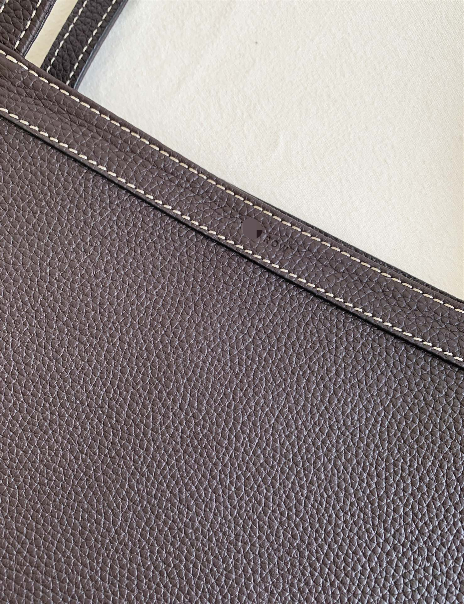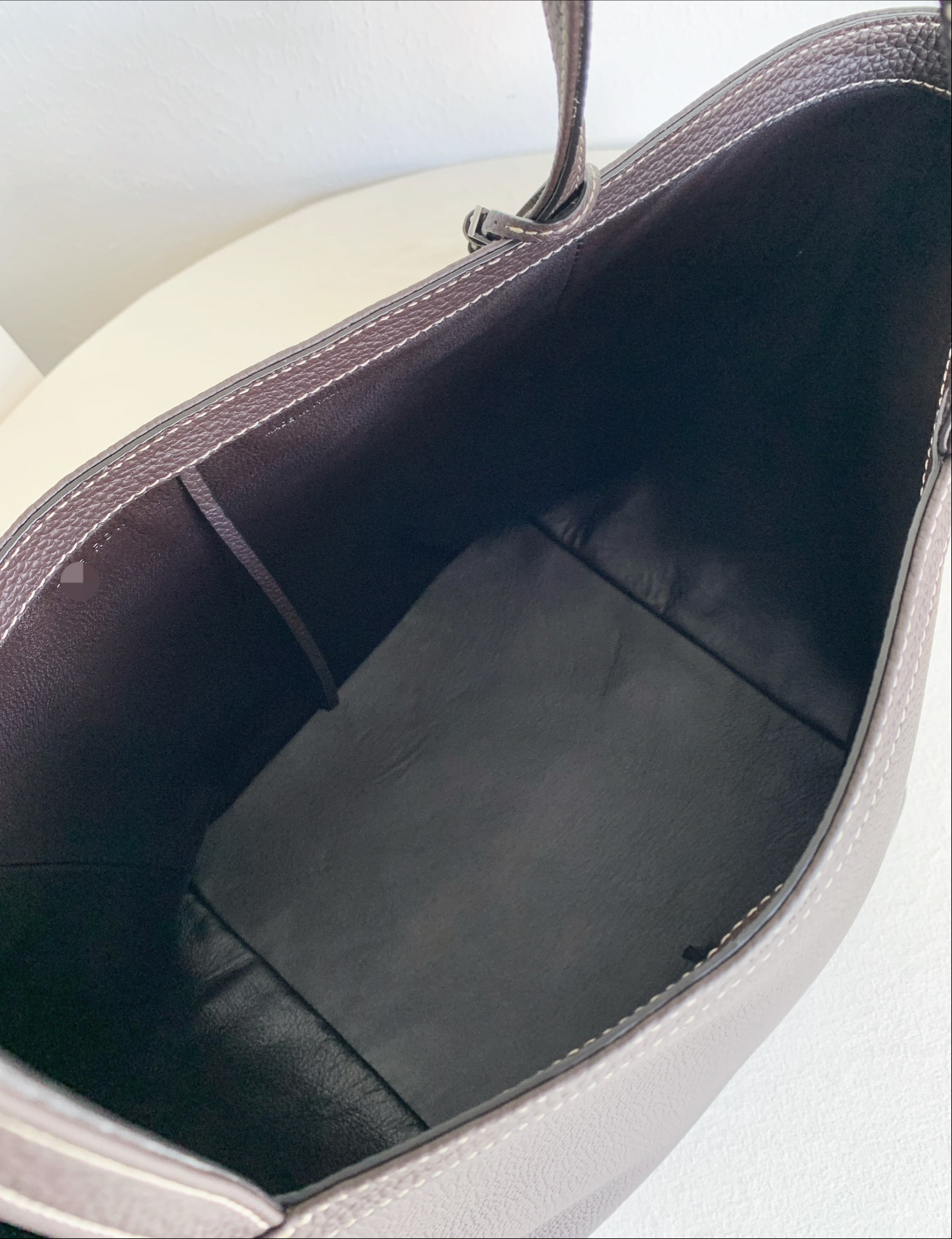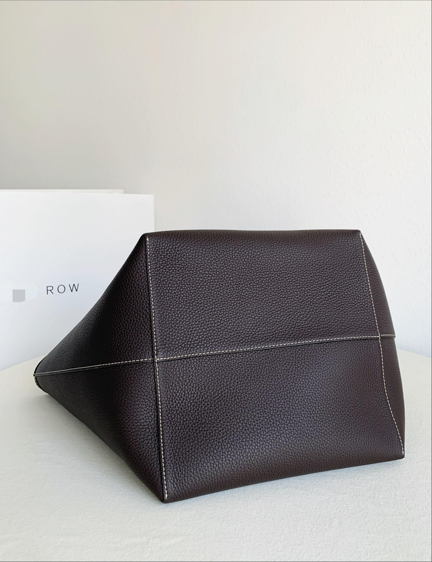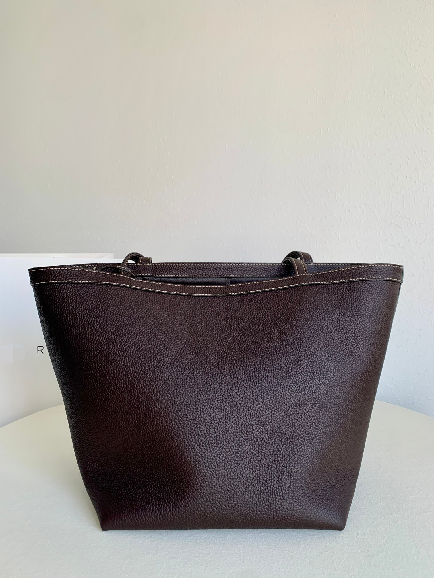 Row Tote Stitch 大號 棕色 外皮採用頭層荔枝紋TC牛皮製作,內裡搭配羊皮。 擁有比較飽滿的顆粒紋理, 包體舒適度拉滿;有一定的垂墜感, 且皮料富有高含量的油脂, 用的時間越長皮質會越柔軟。 搭配一個可拆卸小卡包,繞2圈可以當包掛, 平時也可以放在包內,可兩用搭配。 底面還做了四個真皮墊底,完全不需要擔心摩擦問題,整體包包以明線勾勒出輪廓,簡約大氣!