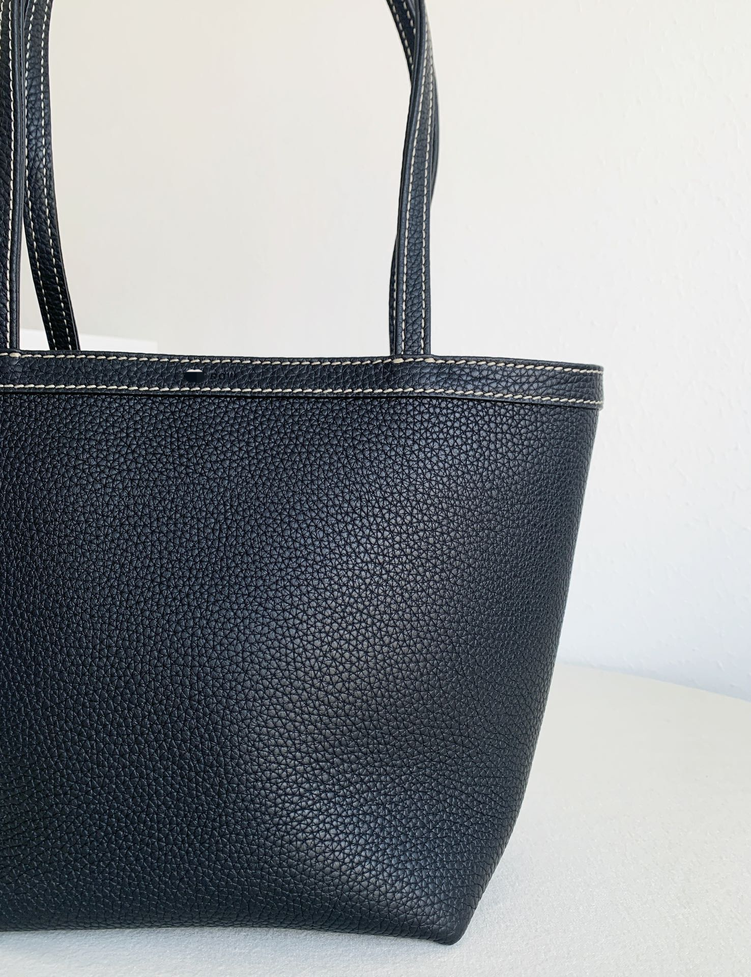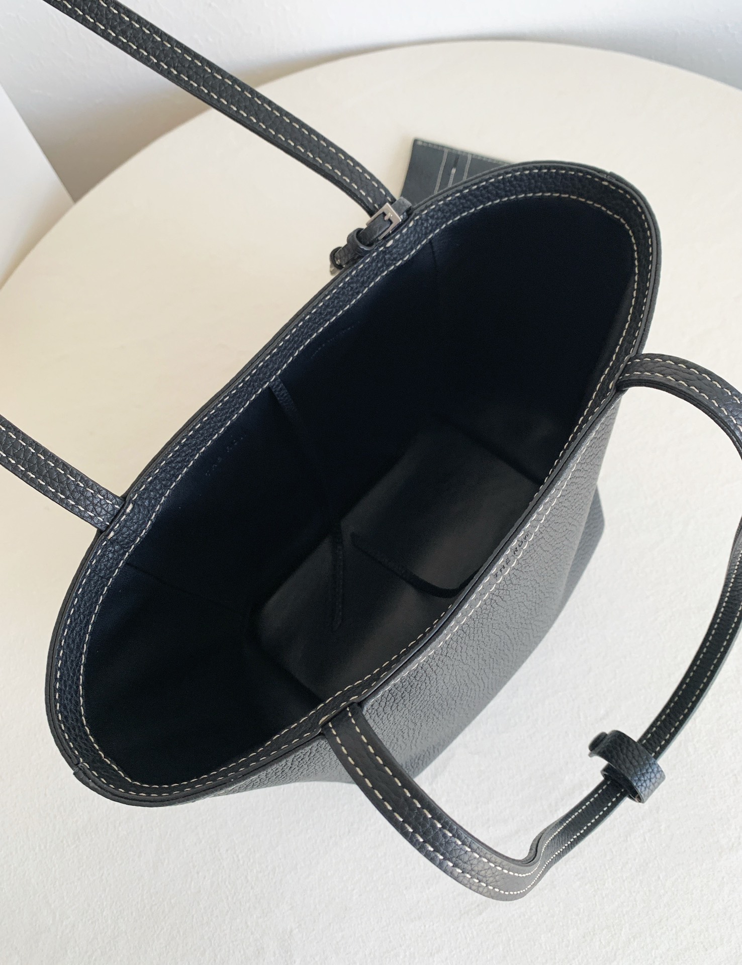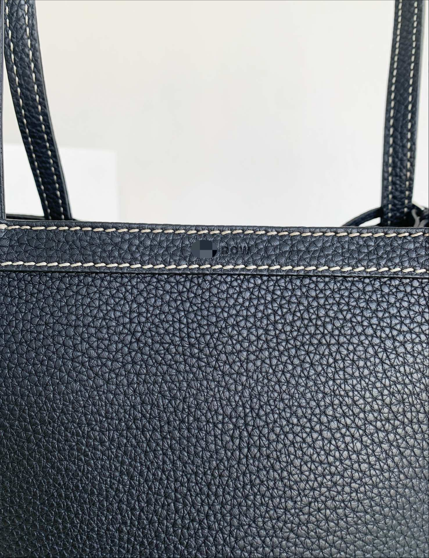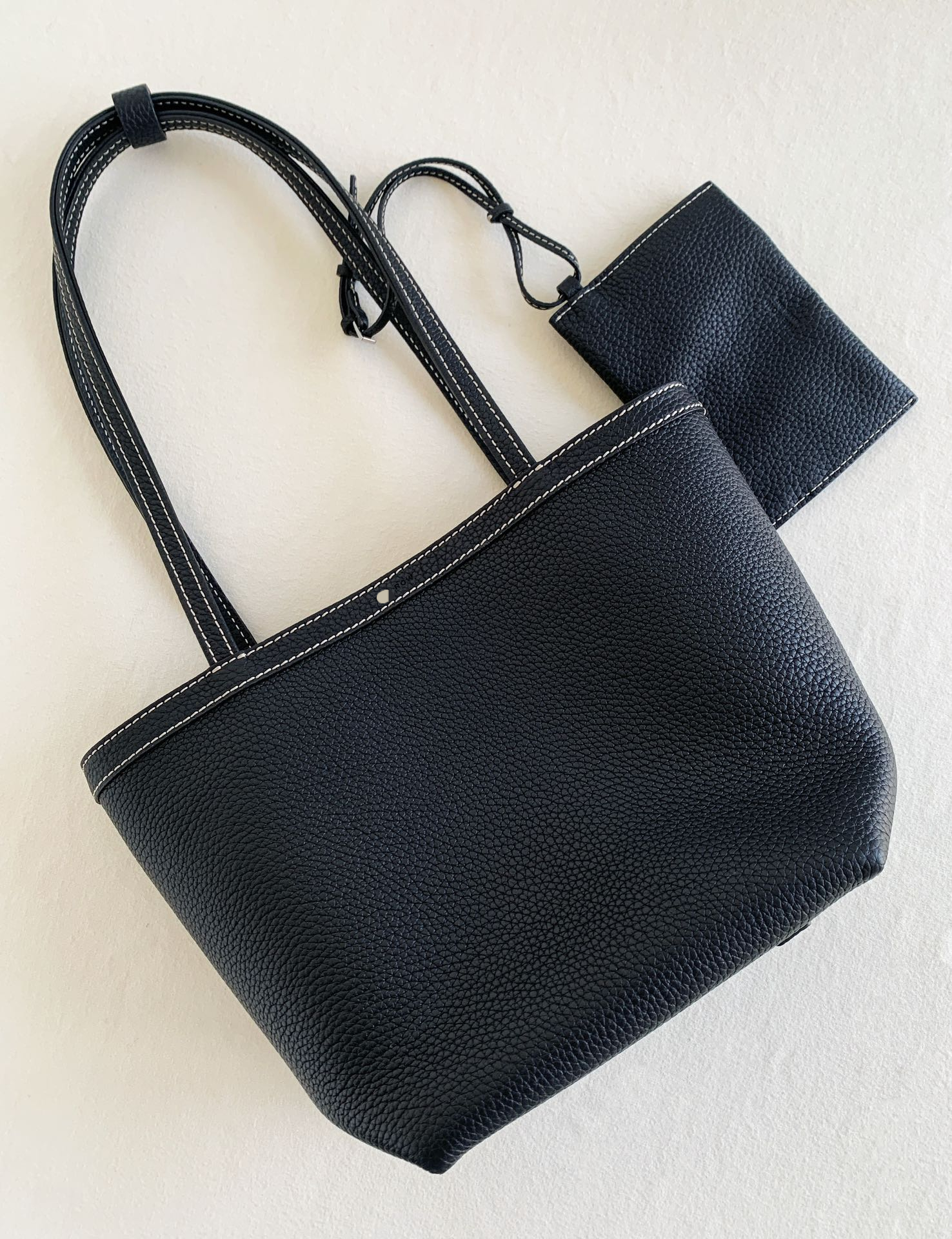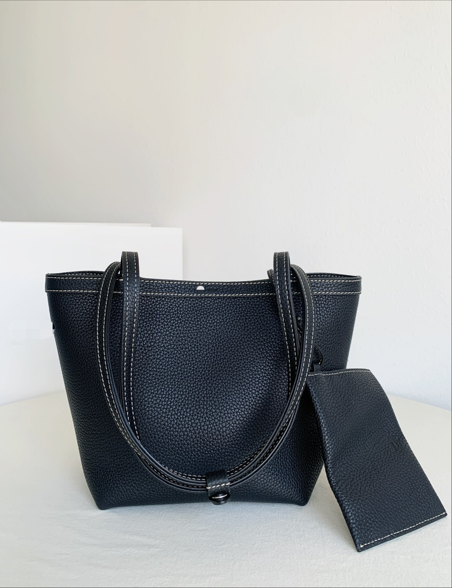 Row Tote Stitch 小號 黑色 外皮採用頭層荔枝紋TC牛皮製作,內裡搭配羊皮。 擁有比較飽滿的顆粒紋理, 包體舒適度拉滿;有一定的垂墜感, 且皮料富有高含量的油脂, 用的時間越長皮質會越柔軟。 搭配一個可拆卸小卡包,繞2圈可以當包掛, 平時也可以放在包內,可兩用搭配。 底面還做了四個真皮墊底,完全不需要擔心摩擦問題,整體包包以明線勾勒出輪廓,簡約大氣 尺寸:19*13*22