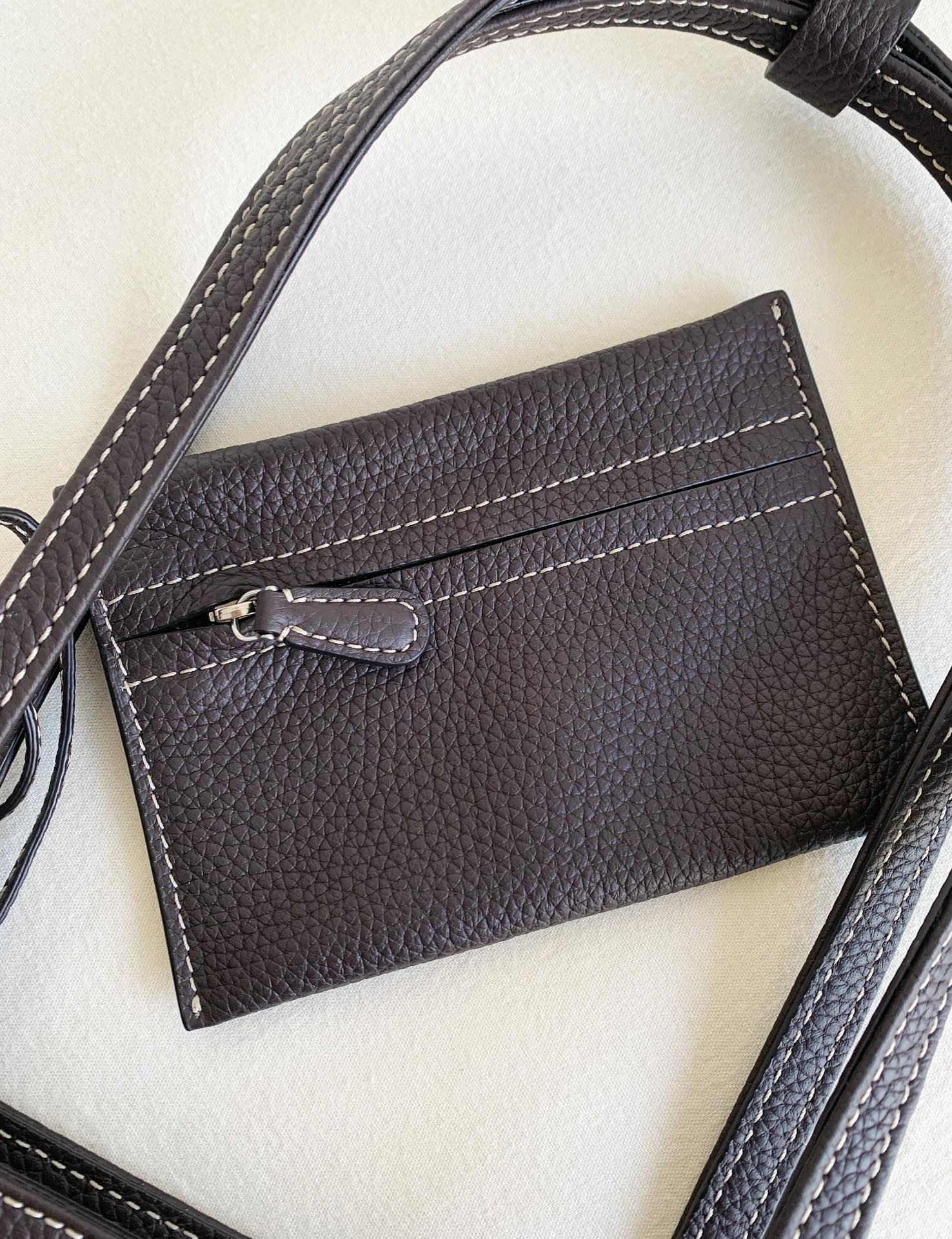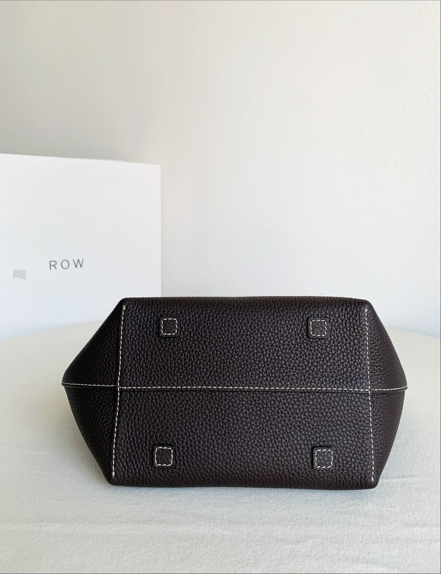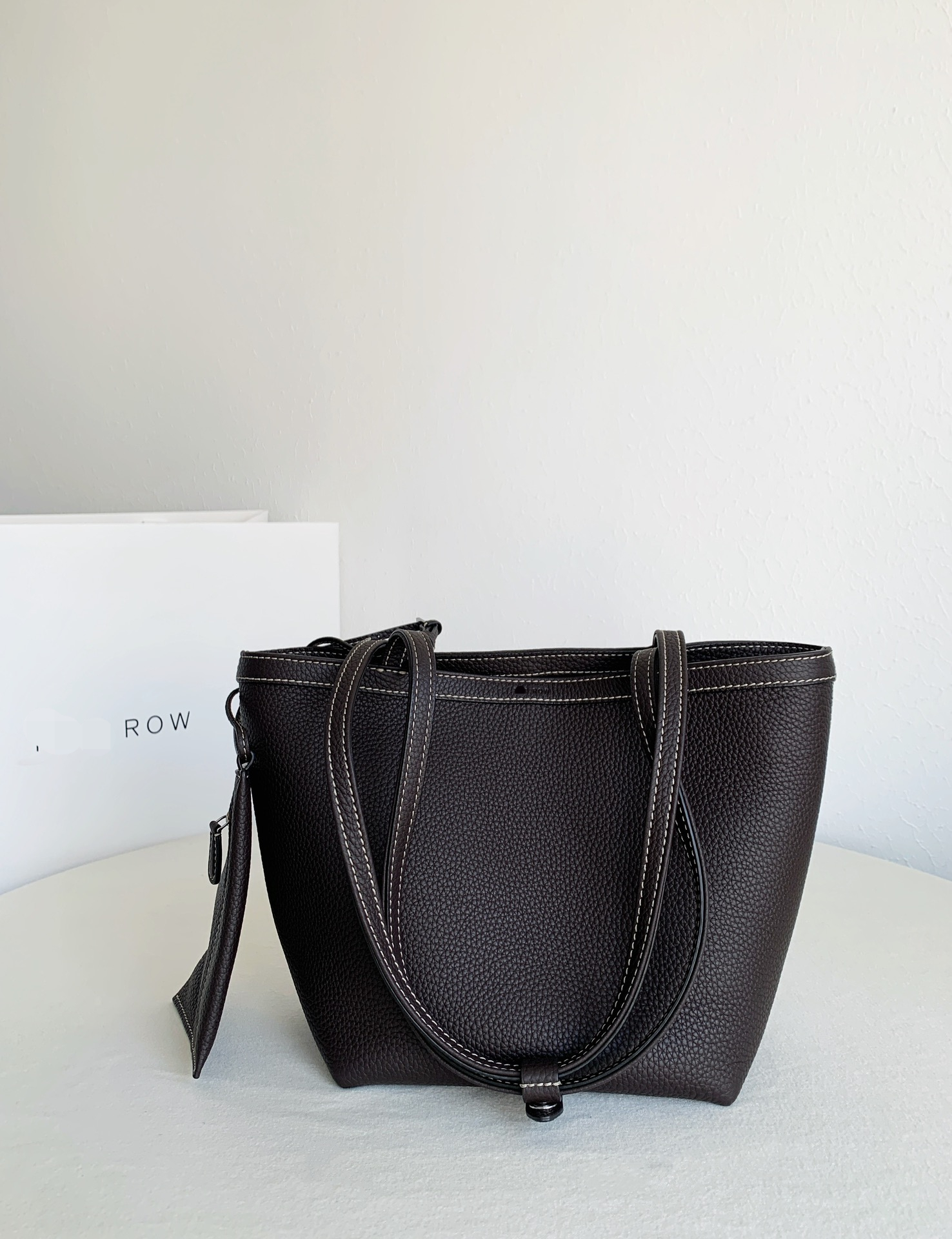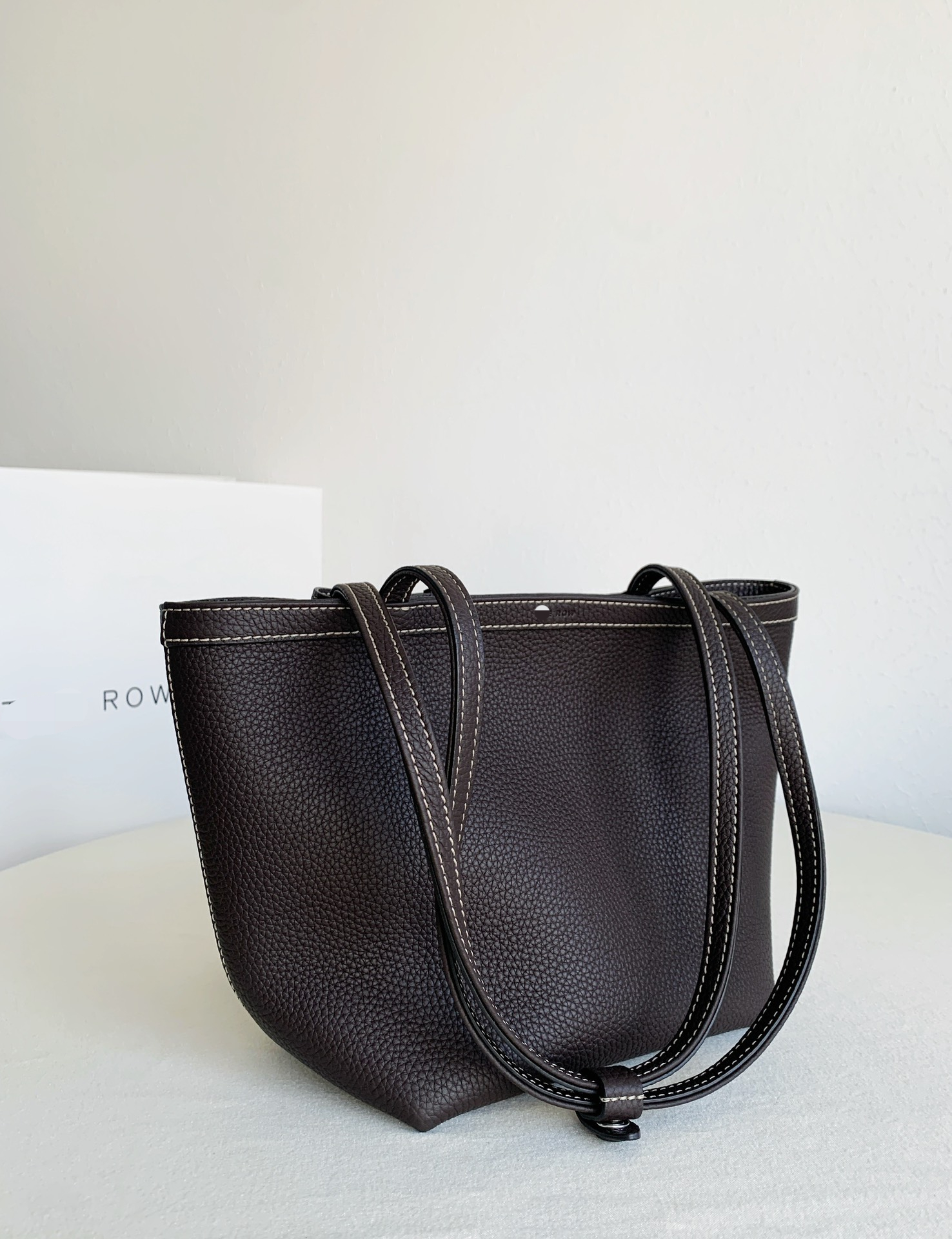 Row Tote Stitch 小號 棕色 外皮採用頭層荔枝紋TC牛皮製作,內裡搭配羊皮。 擁有比較飽滿的顆粒紋理, 包體舒適度拉滿;有一定的垂墜感, 且皮料富有高含量的油脂, 用的時間越長皮質會越柔軟。 搭配一個可拆卸小卡包,繞2圈可以當包掛, 平時也可以放在包內,可兩用搭配。 底面還做了四個真皮墊底,完全不需要擔心摩擦問題,整體包包以明線勾勒出輪廓,簡約大氣 尺寸:19*13*22