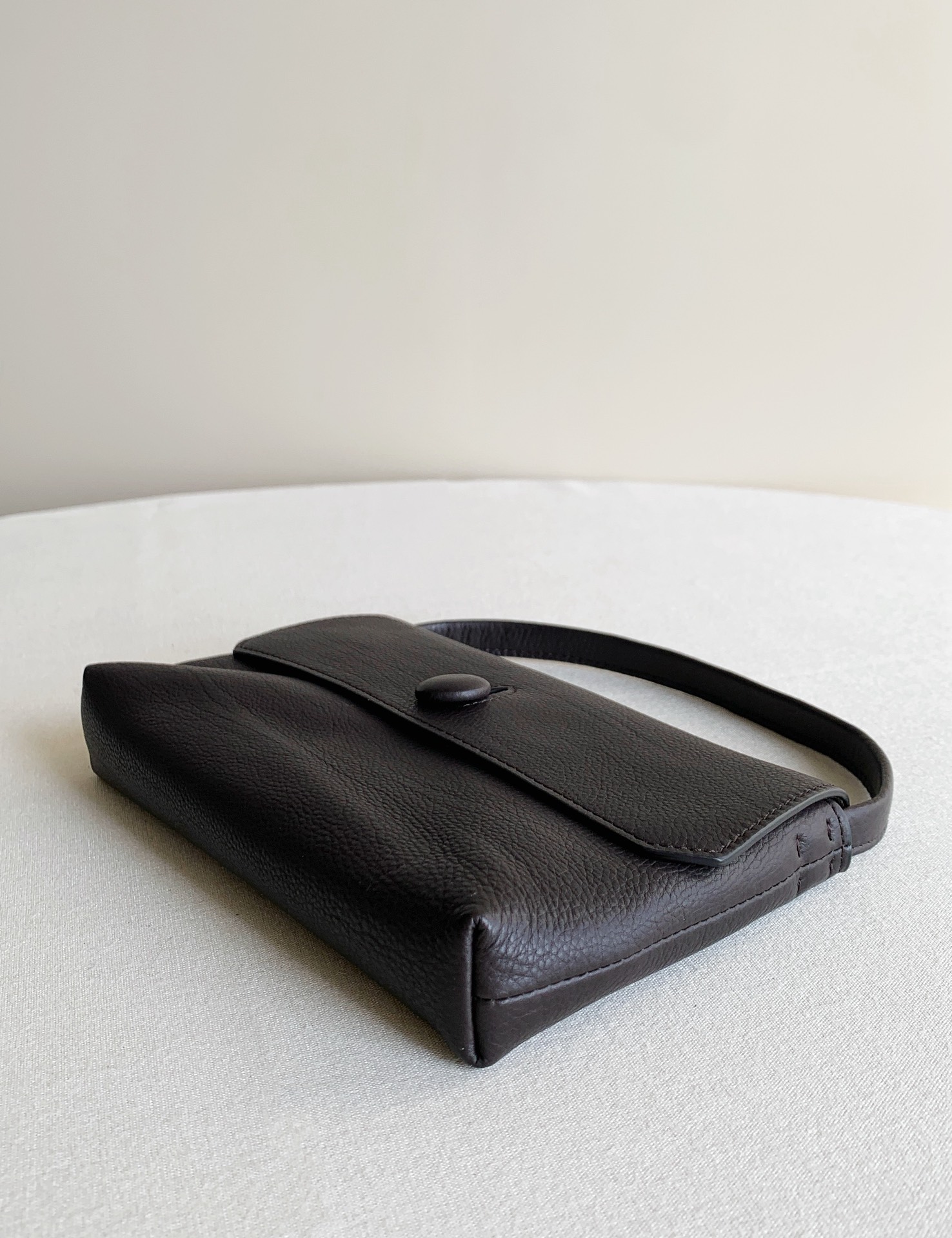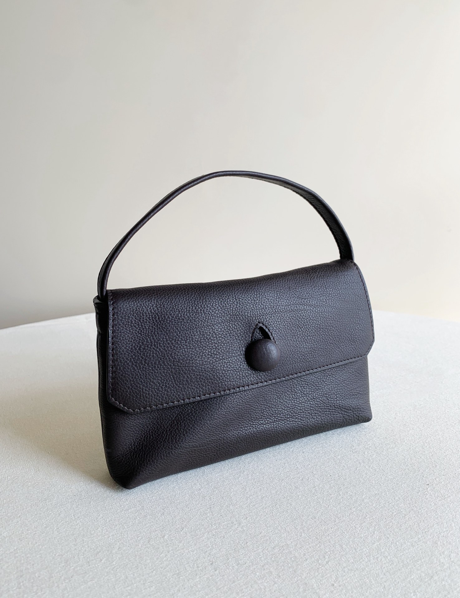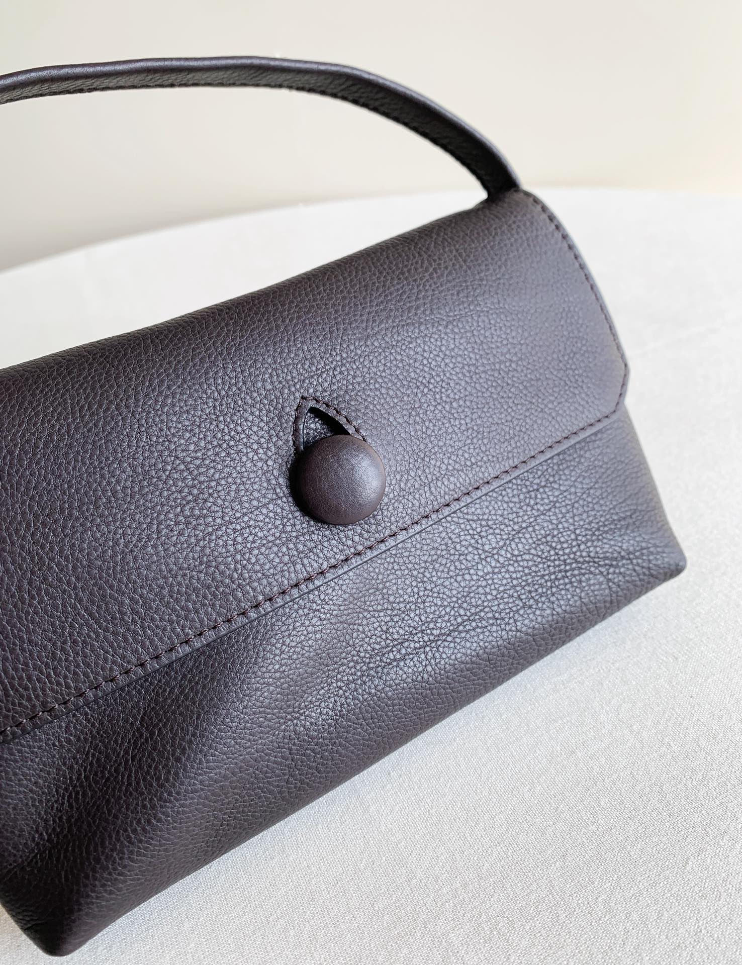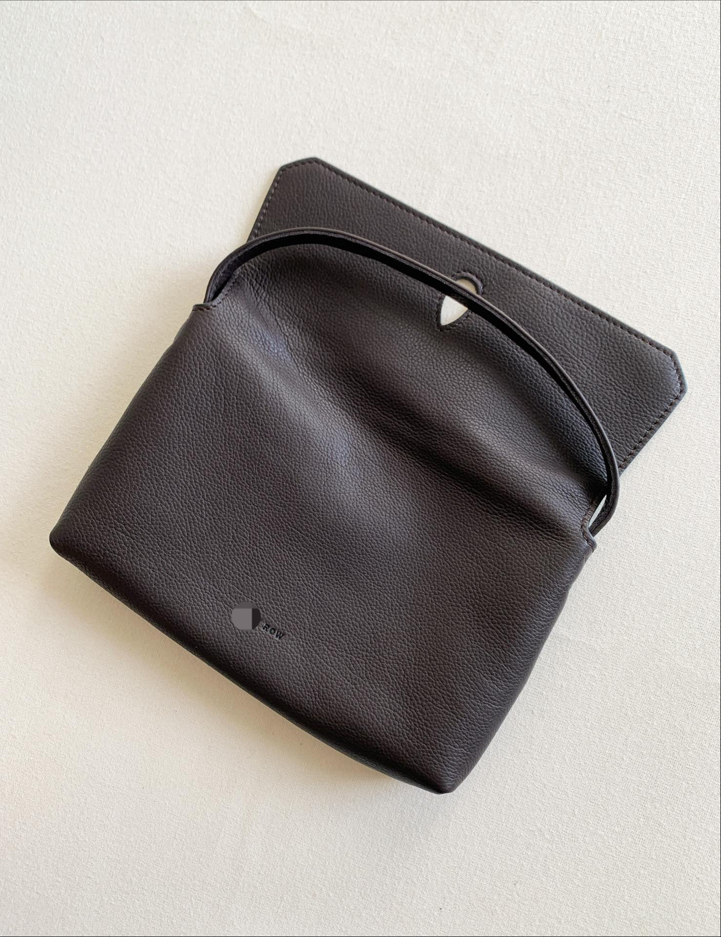 Row Sally紐扣小包 咖啡色 採用國內最高級別血清胎牛皮製成,獨家皮源,市場不流通,配有單根扁平提手和以皮革包扣固定的翻蓋開合。 無襯裡且無外露縫線,保留了柔軟細膩的質感。 該皮革具有油潤手感和微妙光澤,質地柔韌,質感精緻。