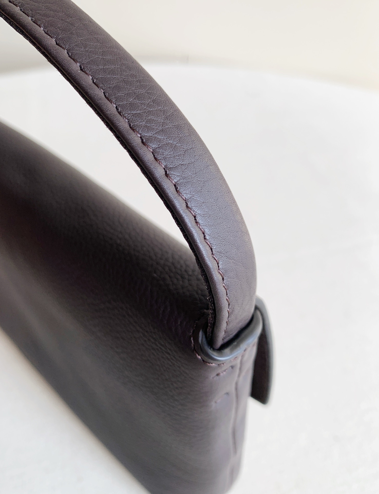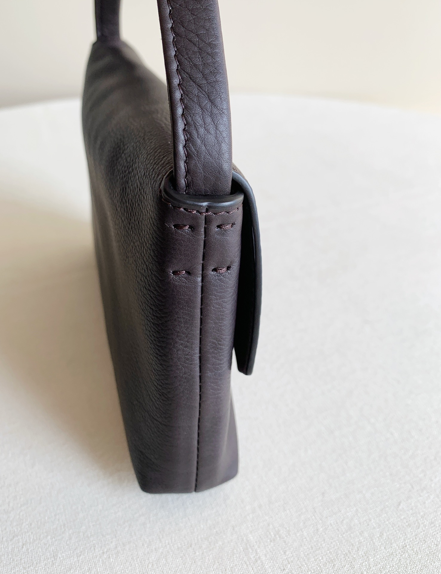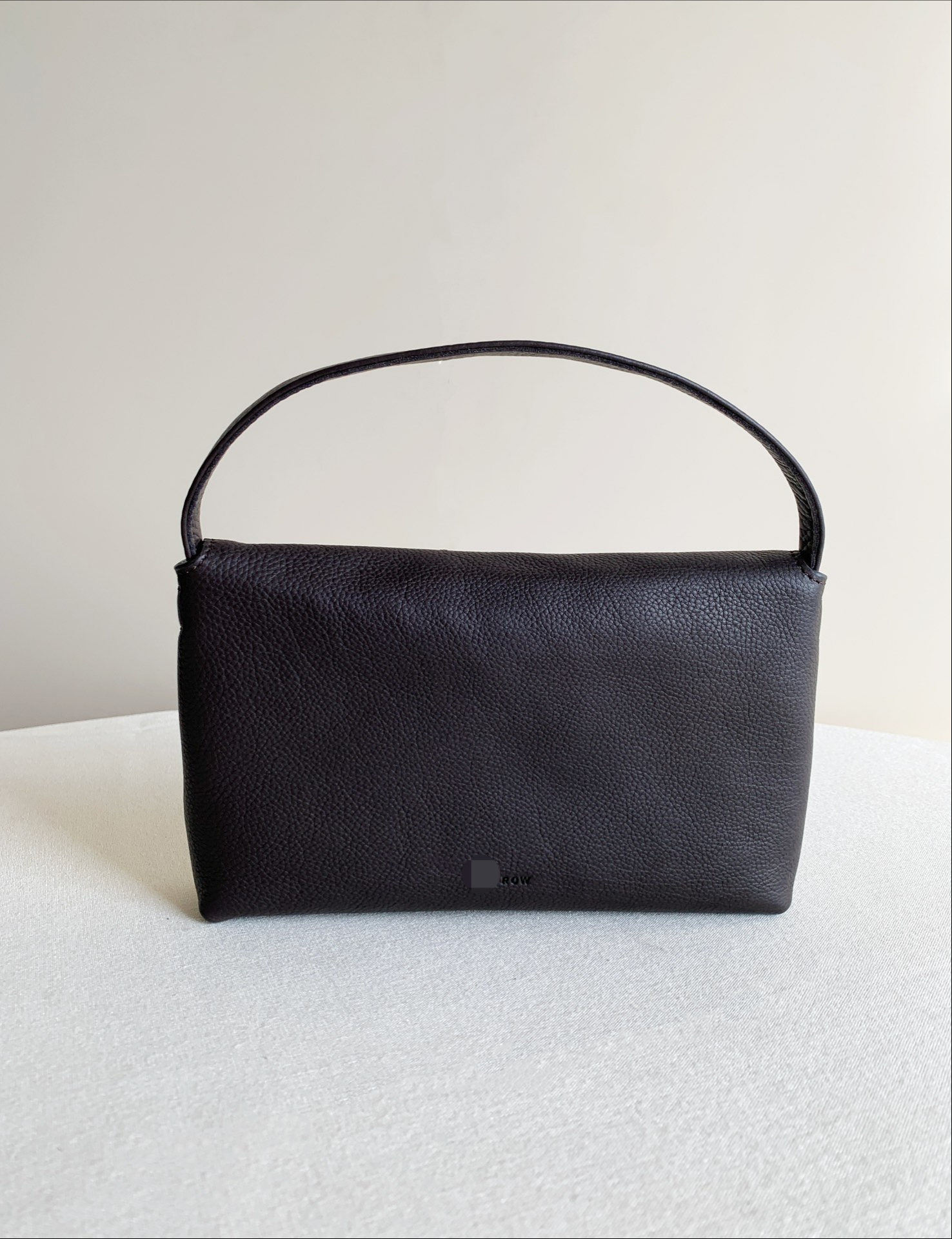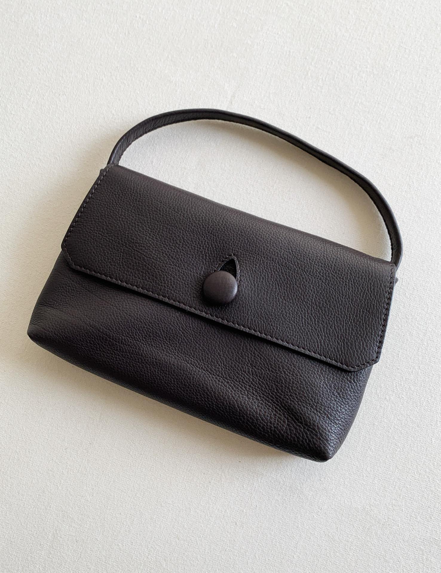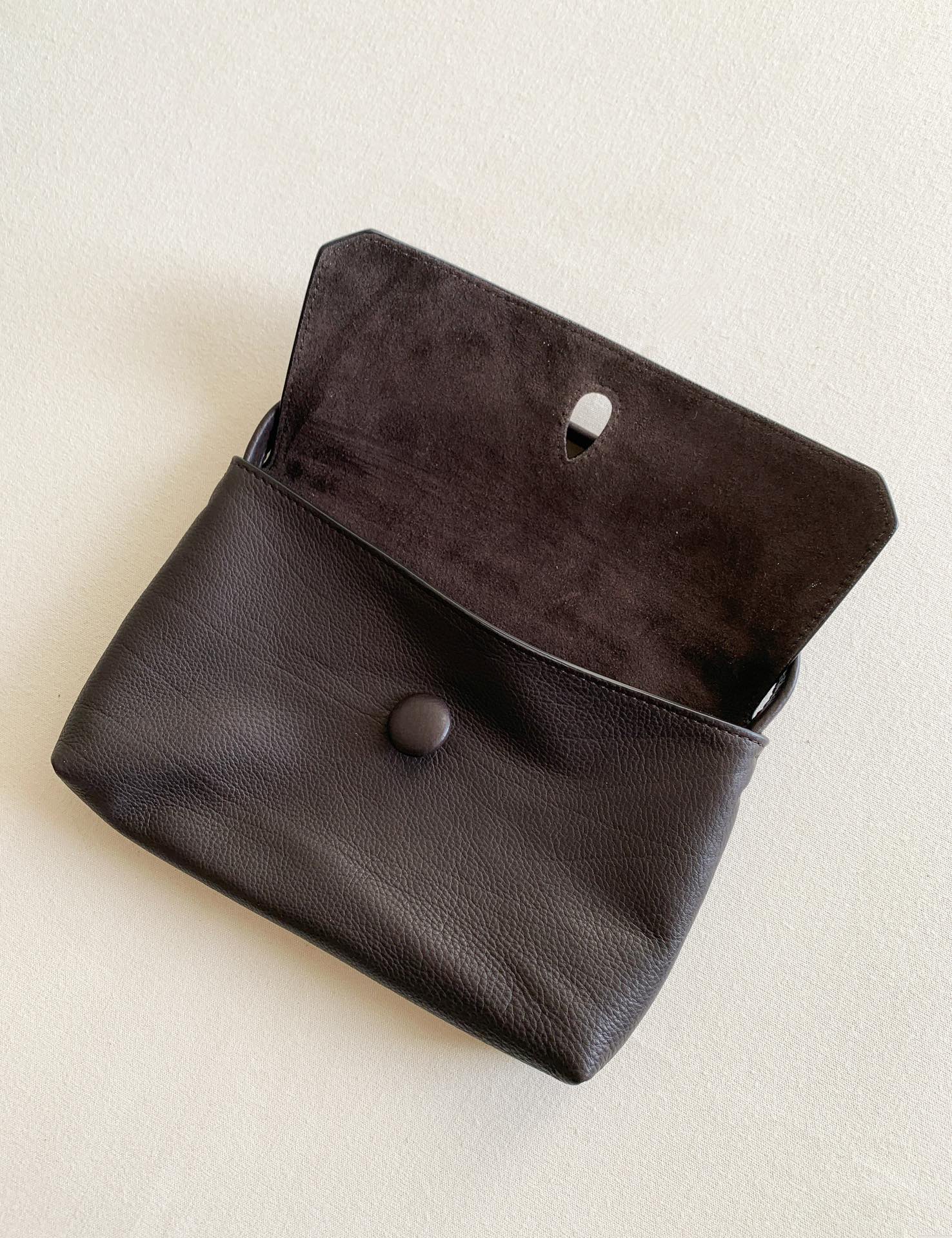 Row Sally紐扣小包 咖啡色 採用國內最高級別血清胎牛皮製成,獨家皮源,市場不流通,配有單根扁平提手和以皮革包扣固定的翻蓋開合。 無襯裡且無外露縫線,保留了柔軟細膩的質感。 該皮革具有油潤手感和微妙光澤,質地柔韌,質感精緻。