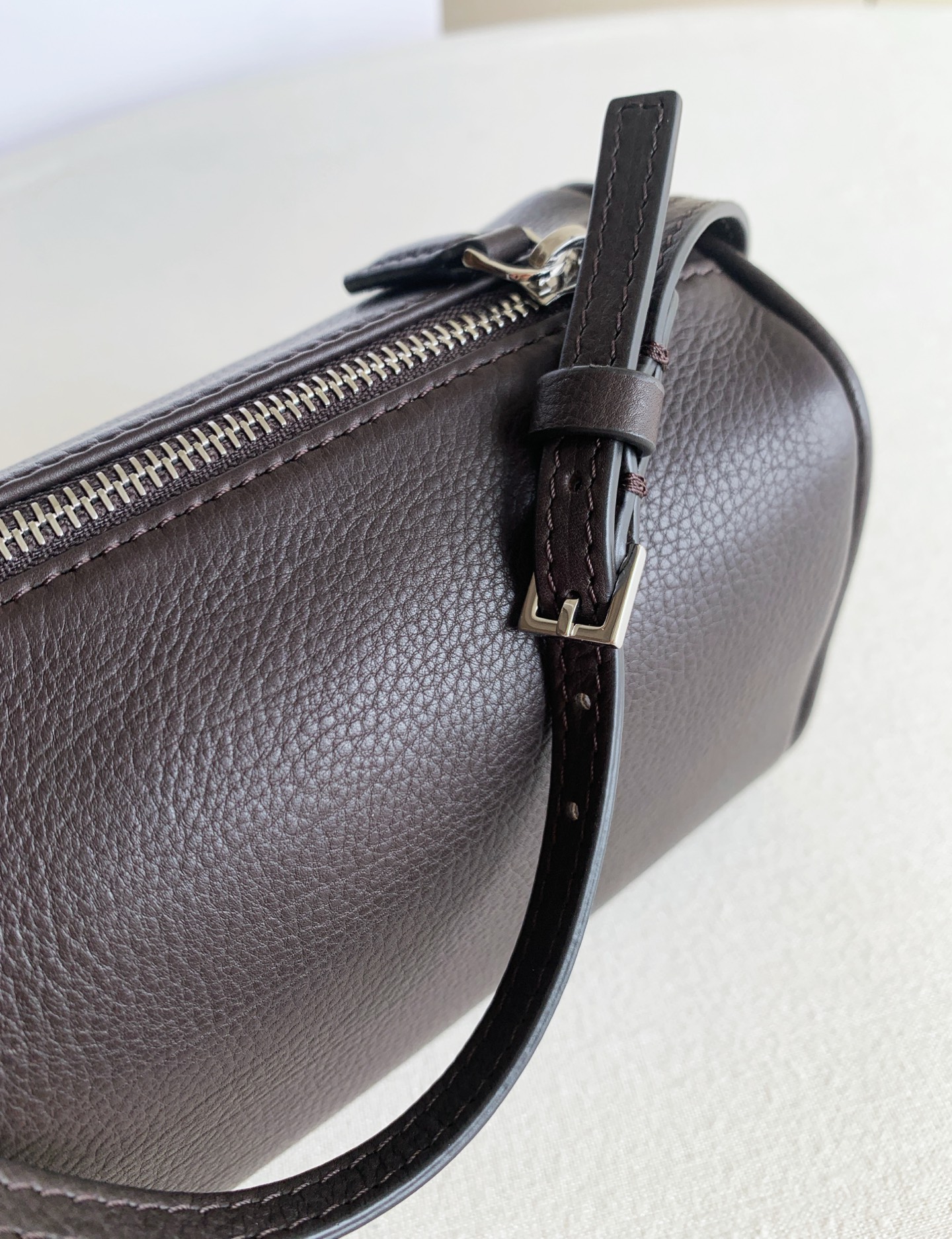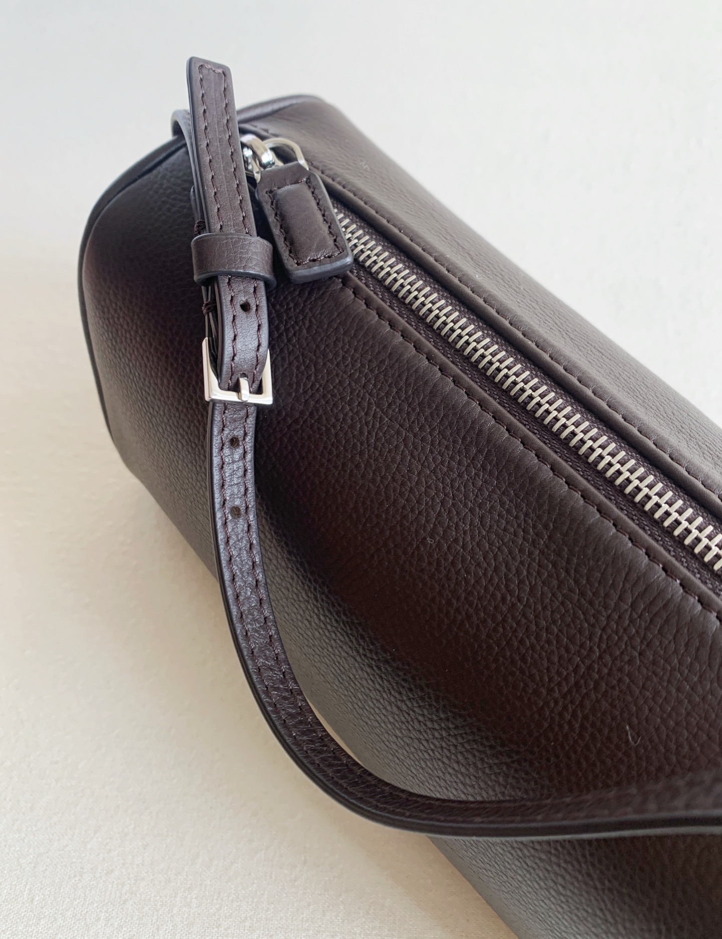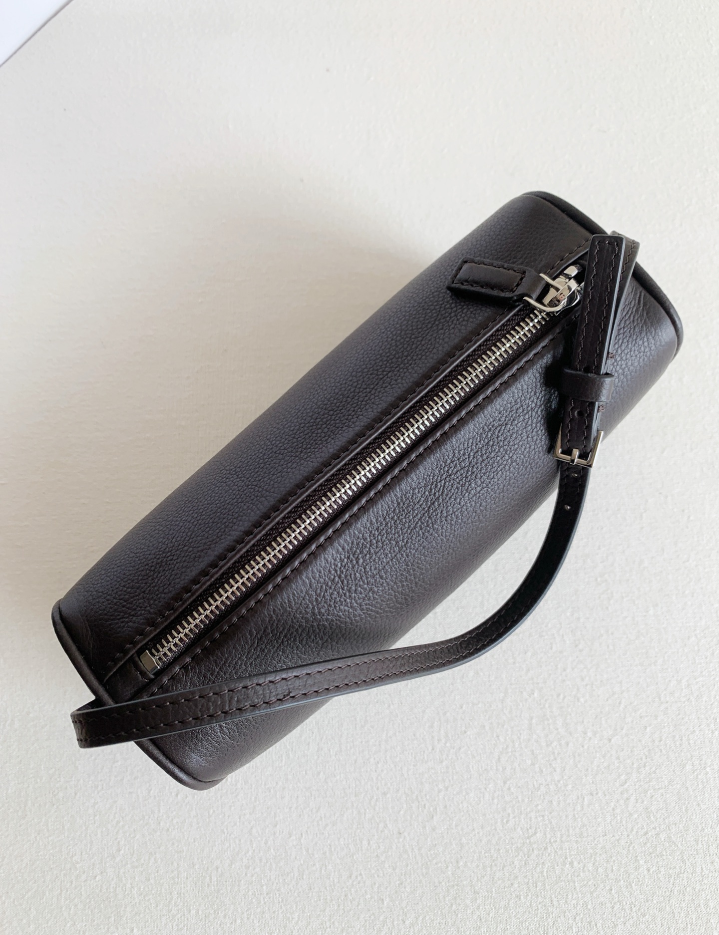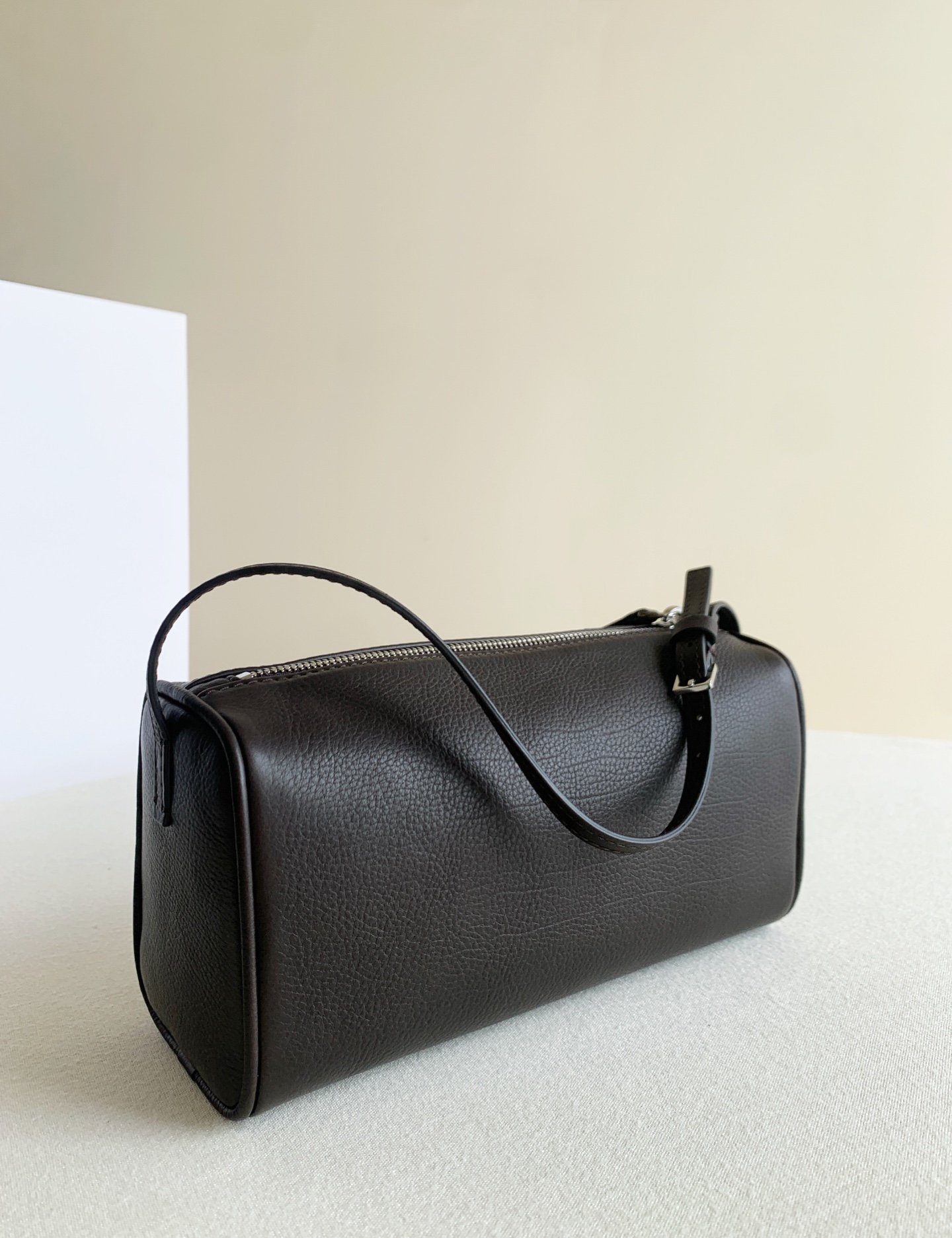 90s筆筒新色深咖啡(deep brown) 近期蕞愛的一隻手拎小包兒,90s 外層胎牛皮,胎牛的紋理更立體清晰,帶有淡淡的牛頸紋,內裡搭配黑色綿羊皮,手感細膩柔軟,容量上很能裝,手機、化妝品,鑰匙,錢包都不在話下!