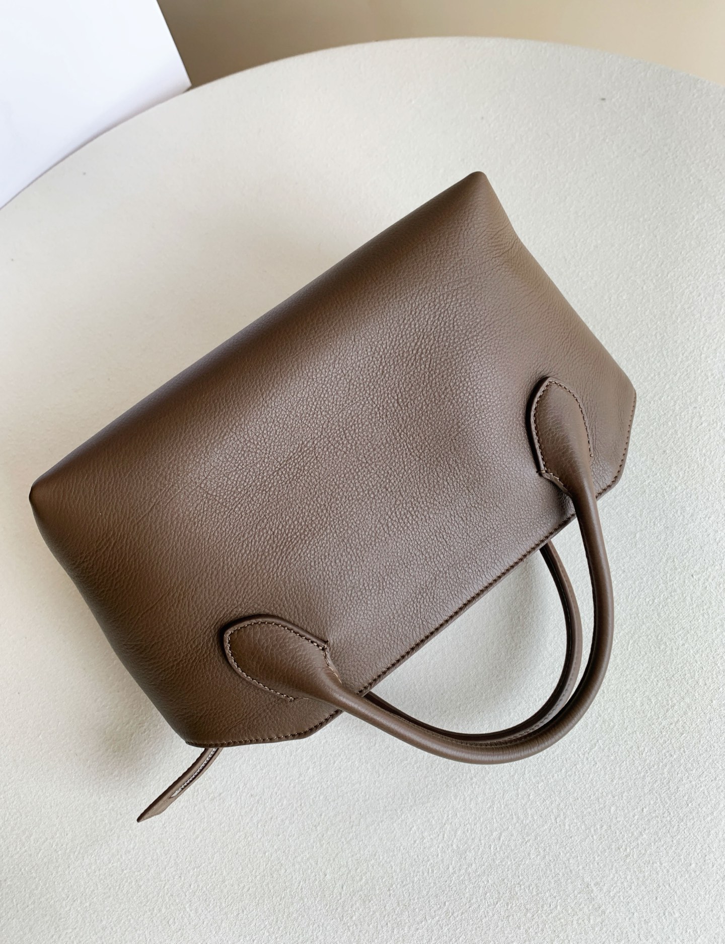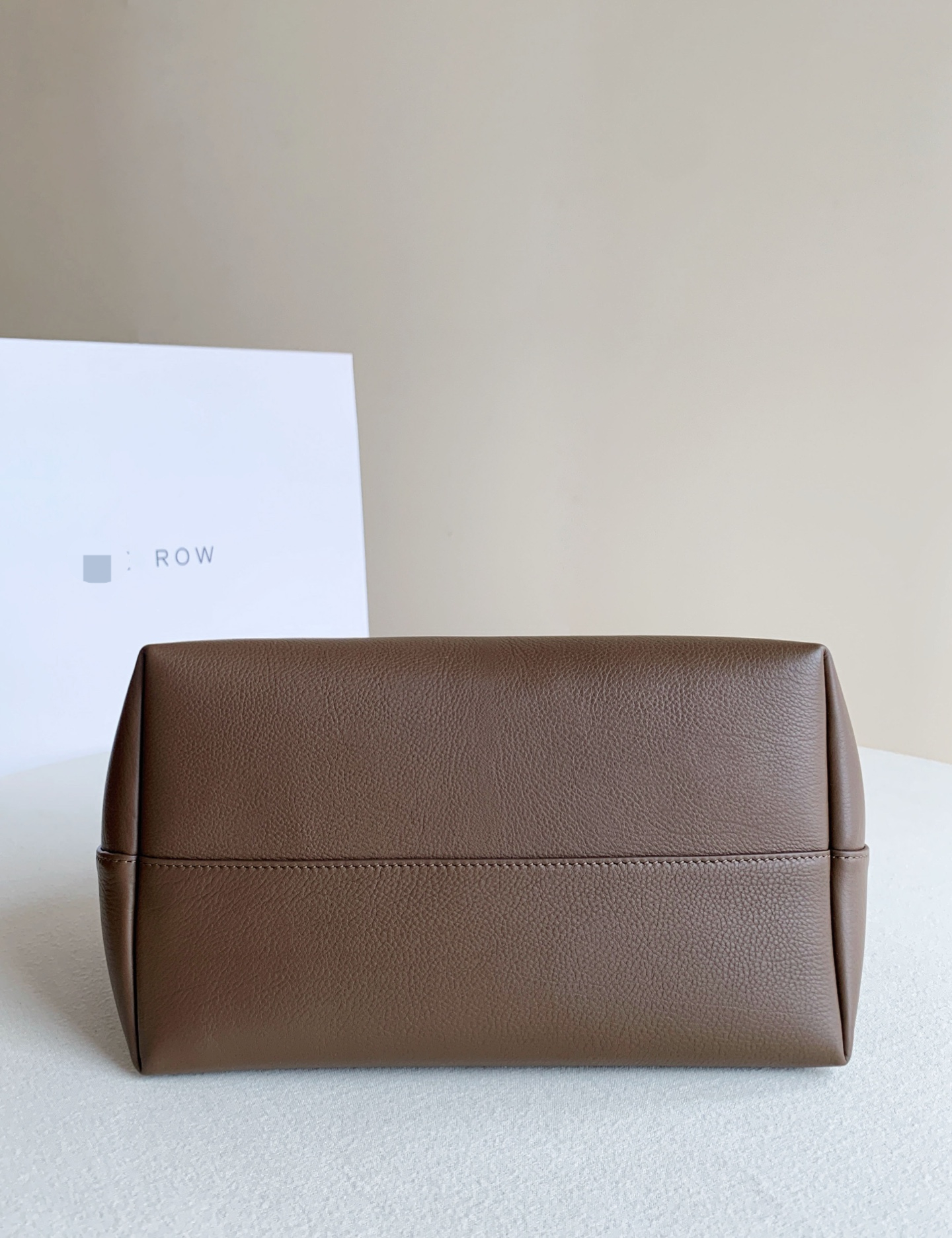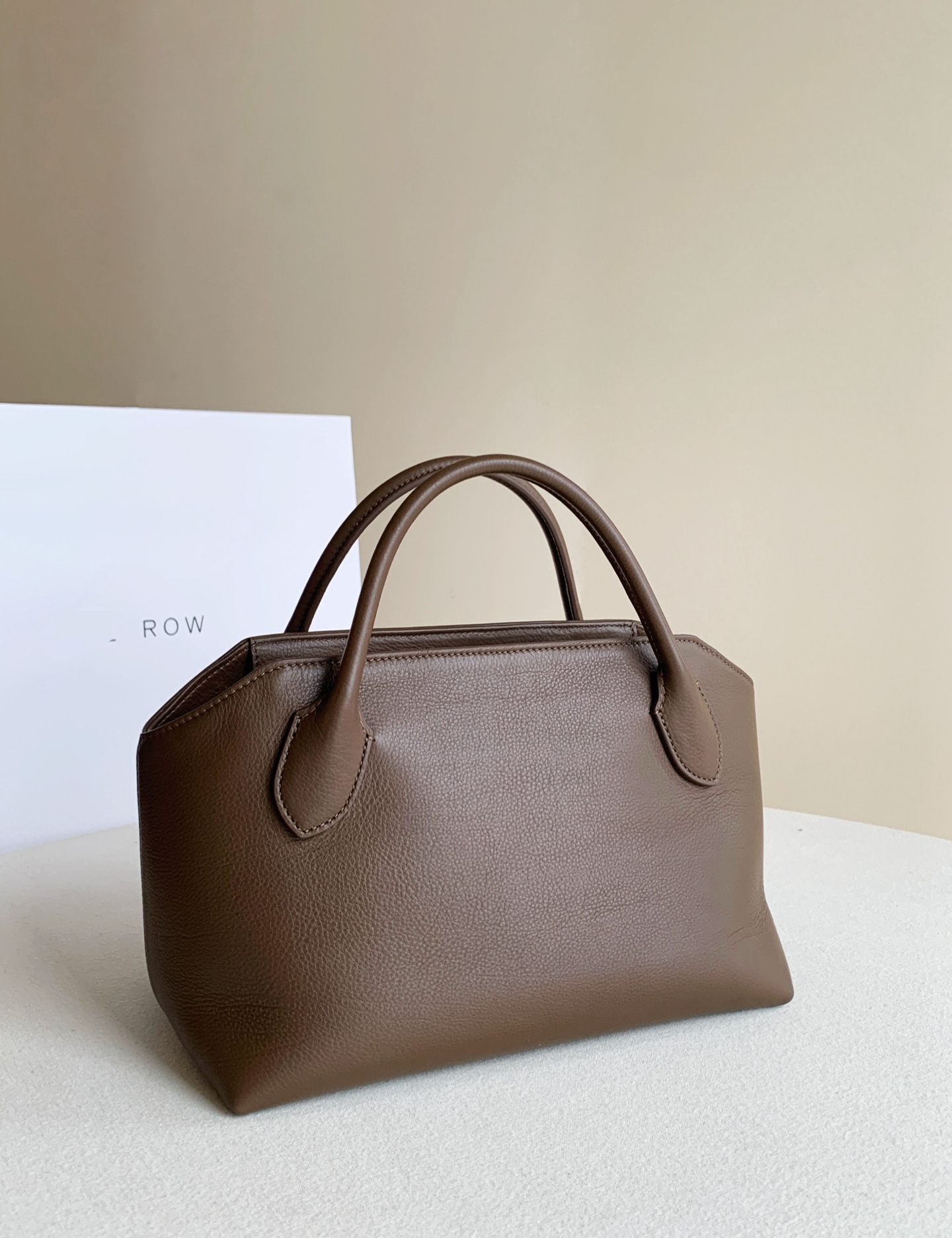 Row Terrasse Bauletto Bag 棕色。作為常年斷貨王系列,這只極簡保齡球包註定是下個爆款。 它延續了The Row標誌性的鬆弛感,胎牛皮血清自然紋路,內襯全羊皮。管狀提手與頂部凹槽設計,柔軟中帶著骨相美。黃金尺寸容量驚人,通勤休閒隨意切換!