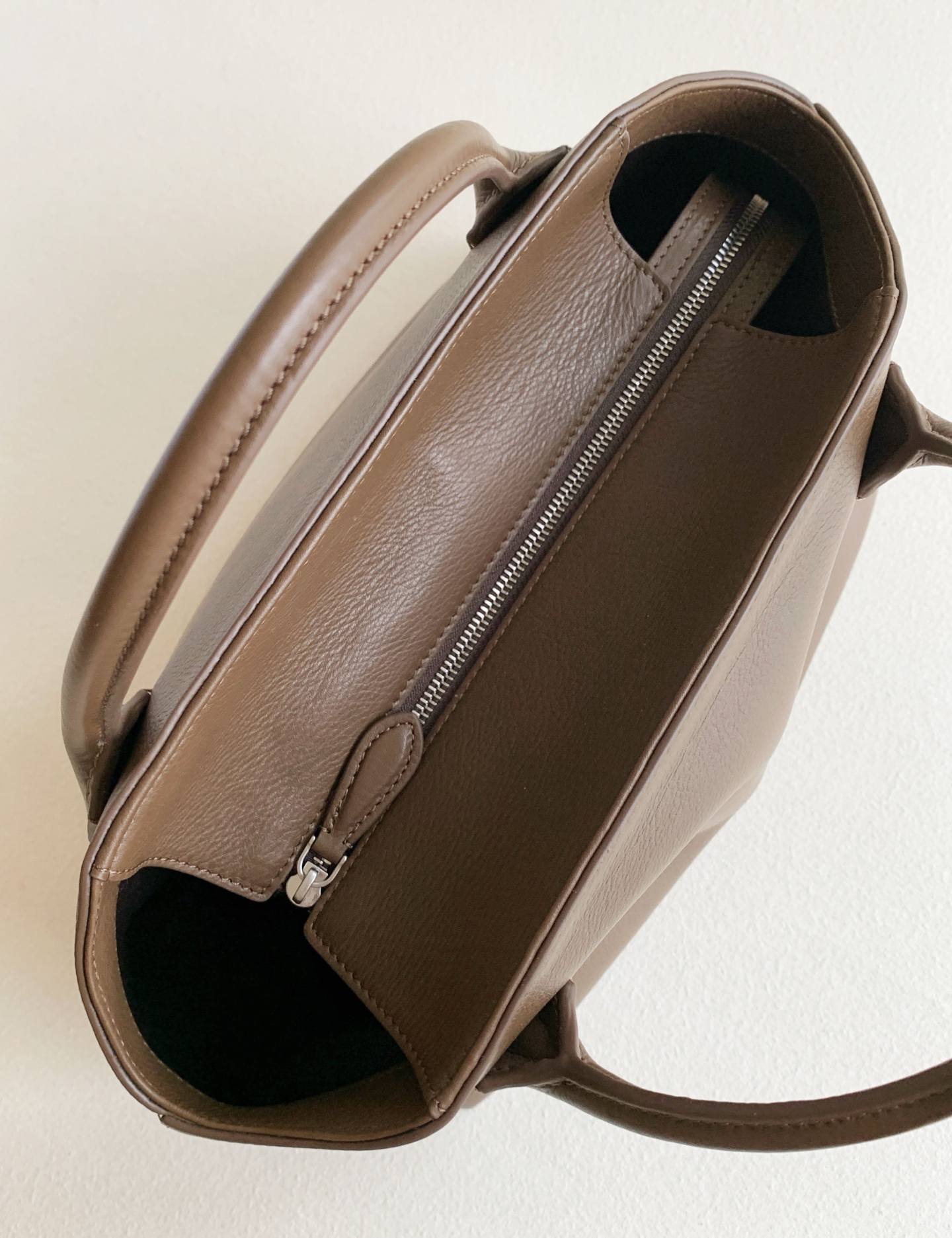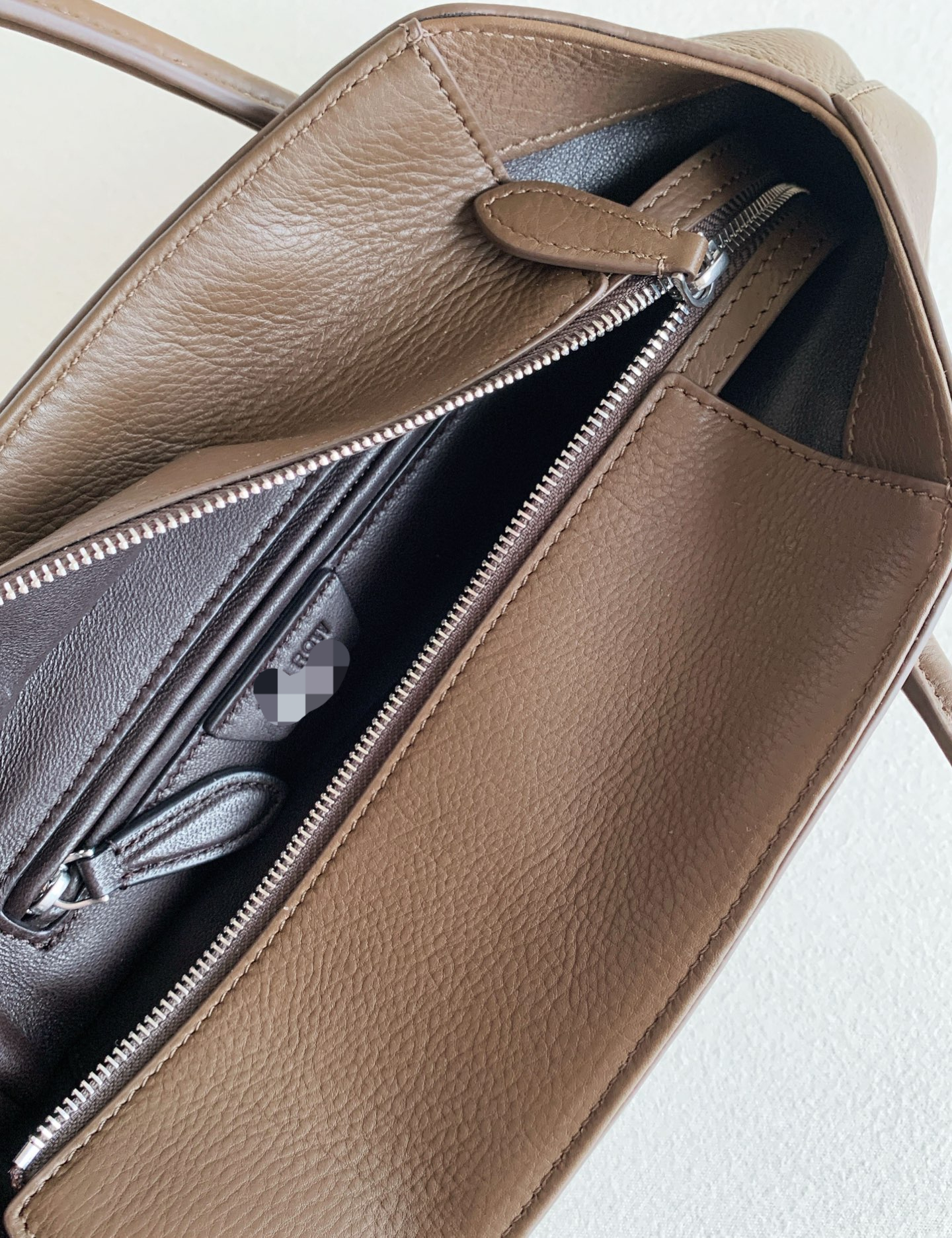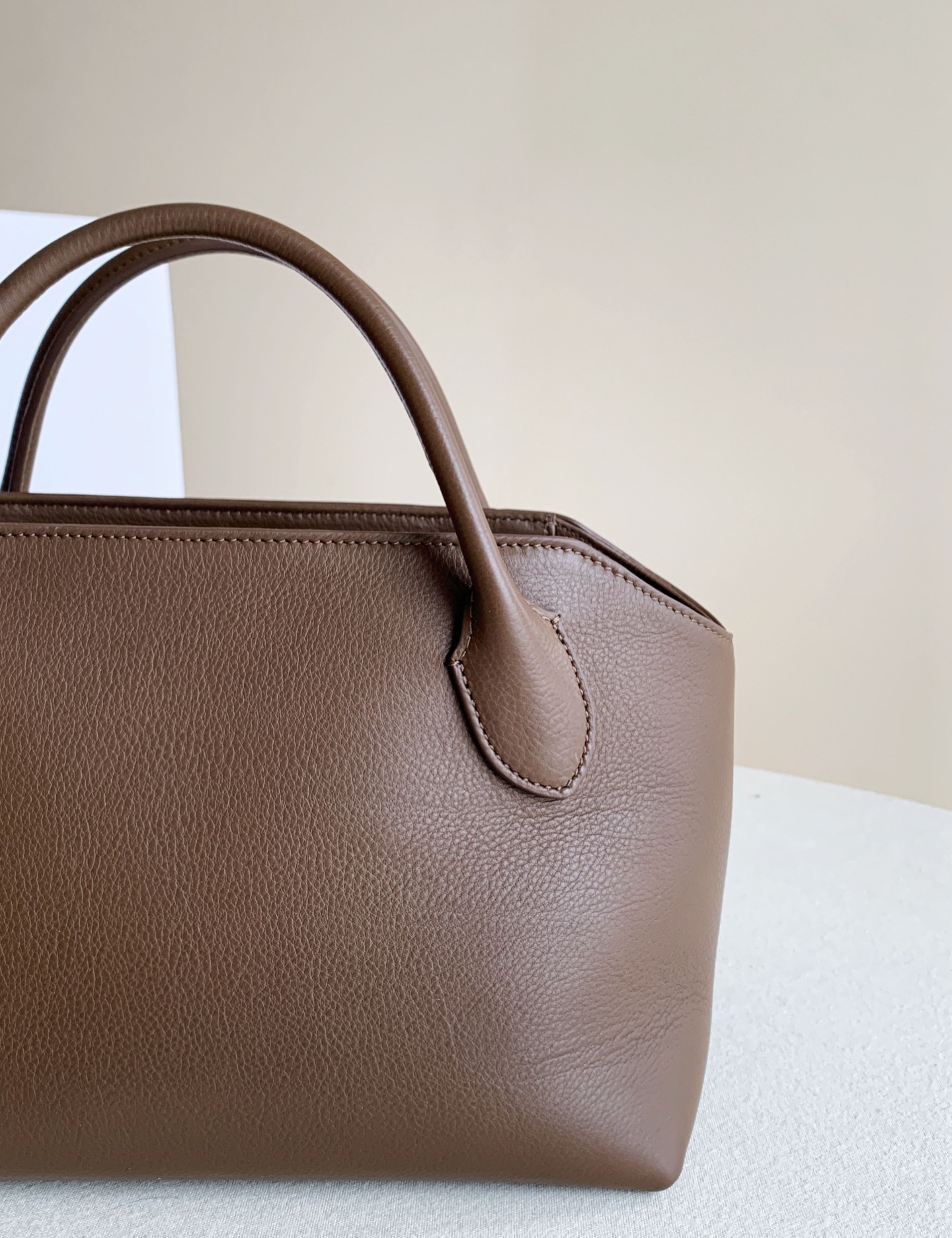 Row Terrasse Bauletto Bag 棕色。作為常年斷貨王系列,這只極簡保齡球包註定是下個爆款。 它延續了The Row標誌性的鬆弛感,胎牛皮血清自然紋路,內襯全羊皮。管狀提手與頂部凹槽設計,柔軟中帶著骨相美。黃金尺寸容量驚人,通勤休閒隨意切換!