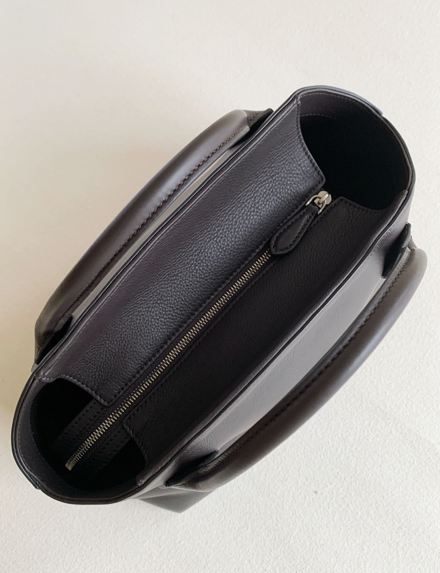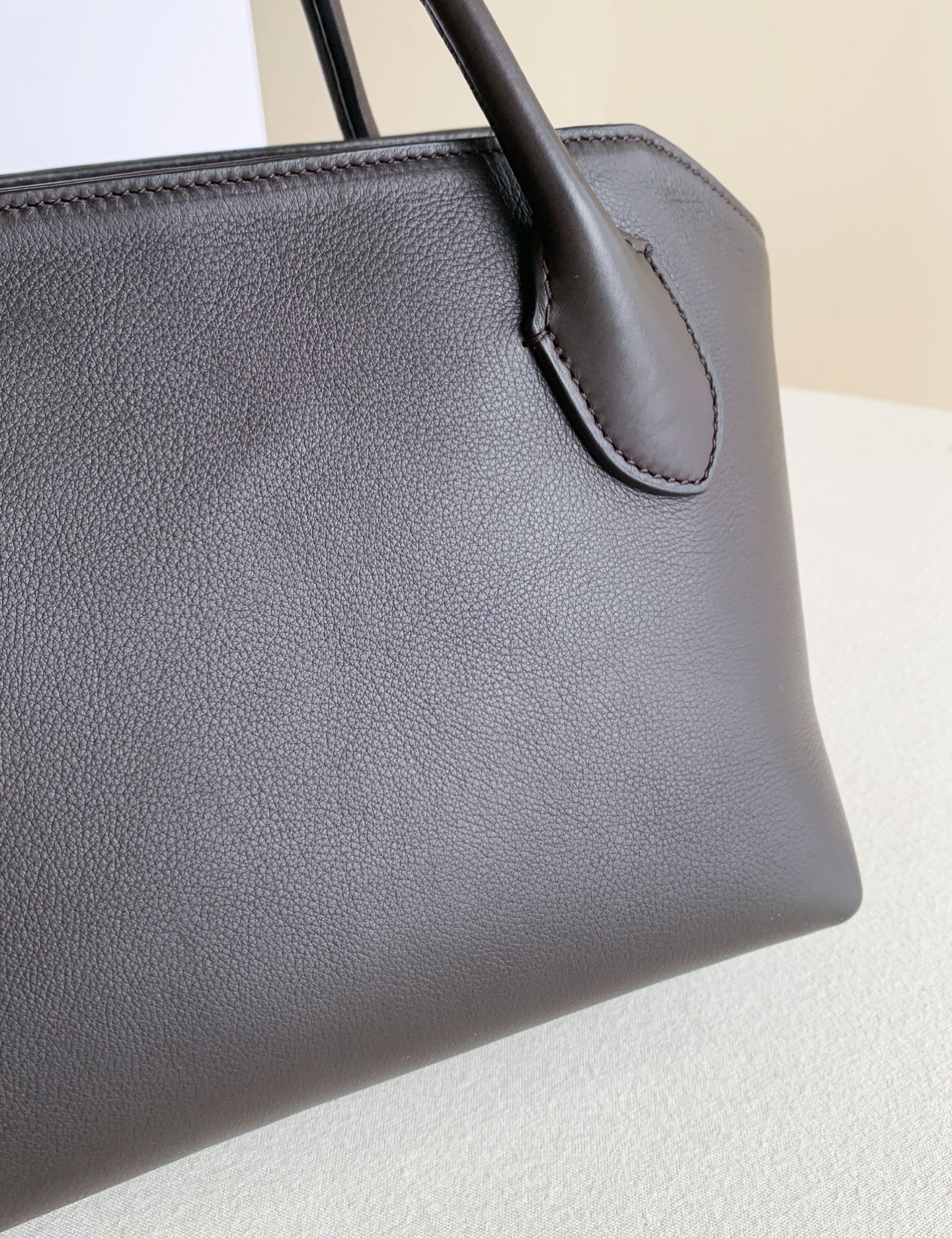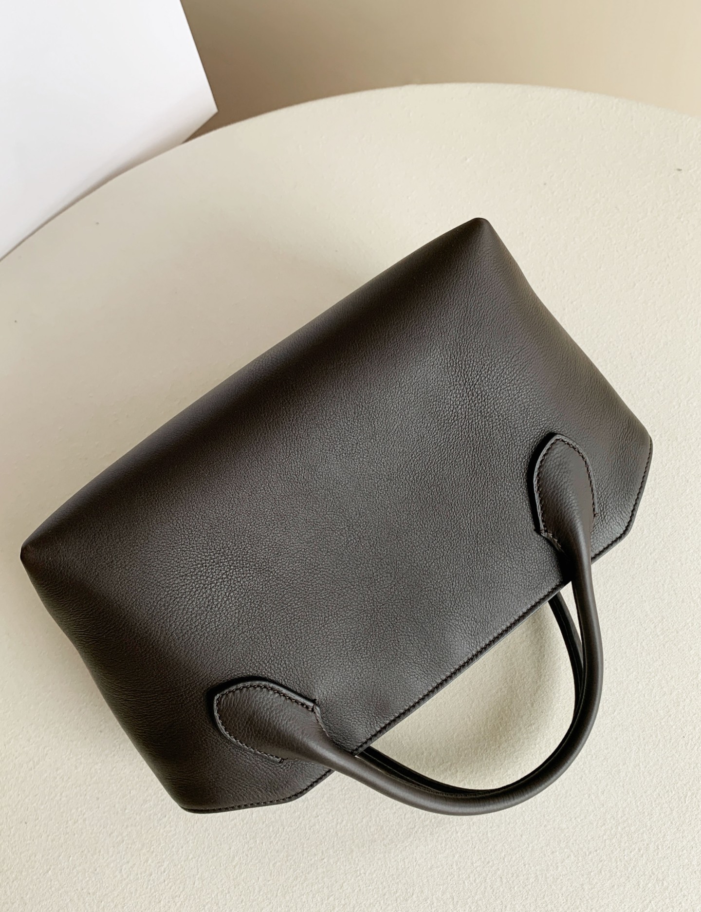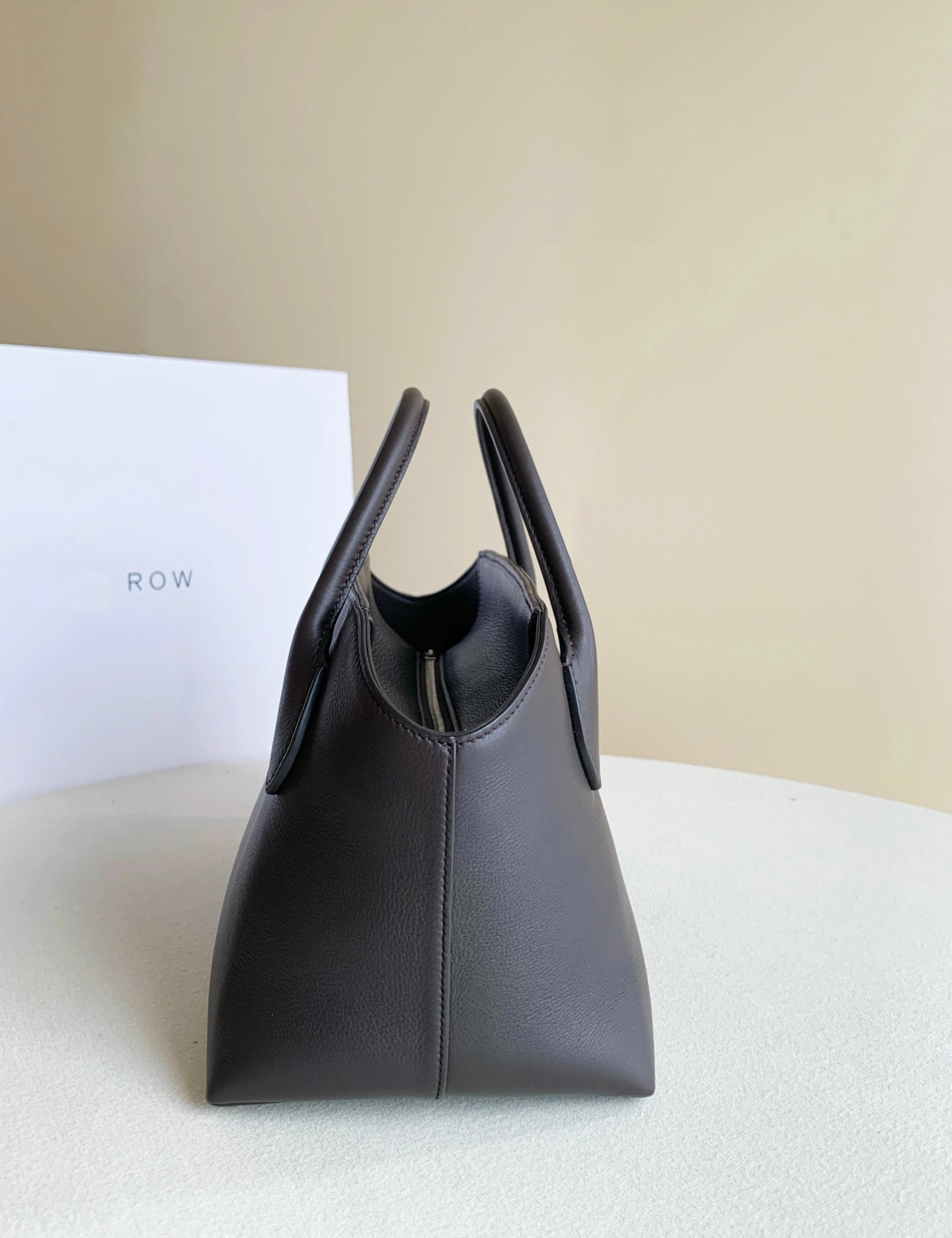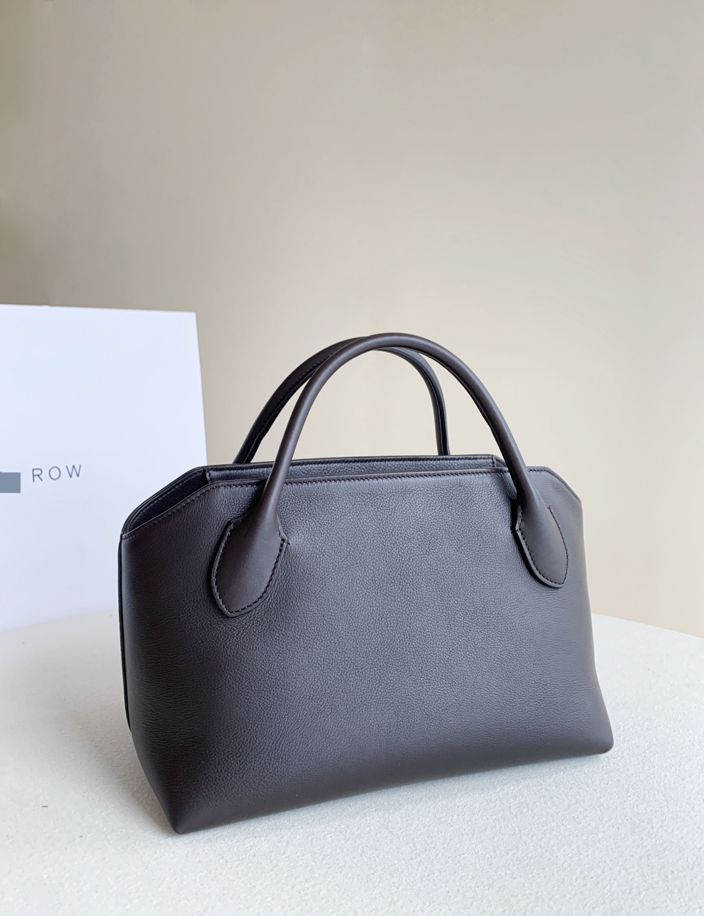 Row Terrasse Bauletto Bag 深咖。作為常年斷貨王系列,這只極簡保齡球包註定是下個爆款。 它延續了The Row標誌性的鬆弛感,胎牛皮血清自然紋路,內襯全羊皮。管狀提手與頂部凹槽設計,柔軟中帶著骨相美。黃金尺寸容量驚人,通勤休閒隨意切換!