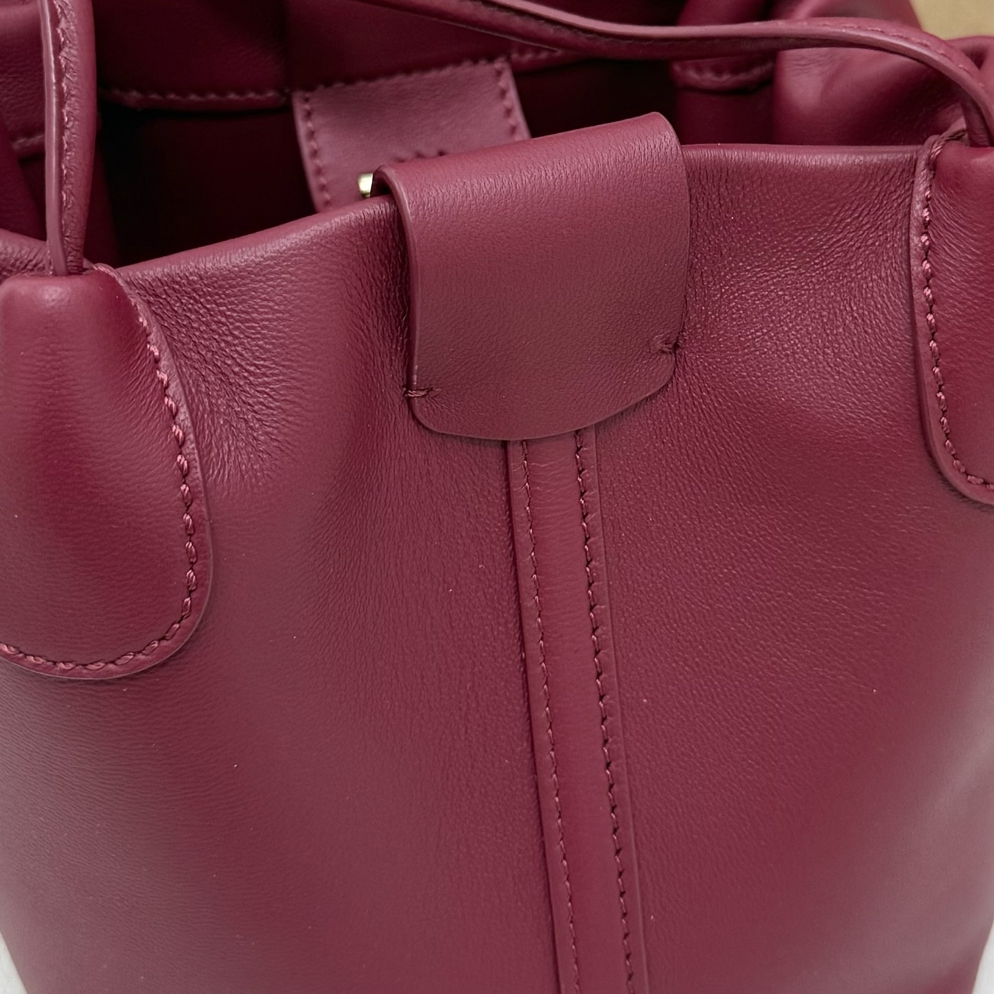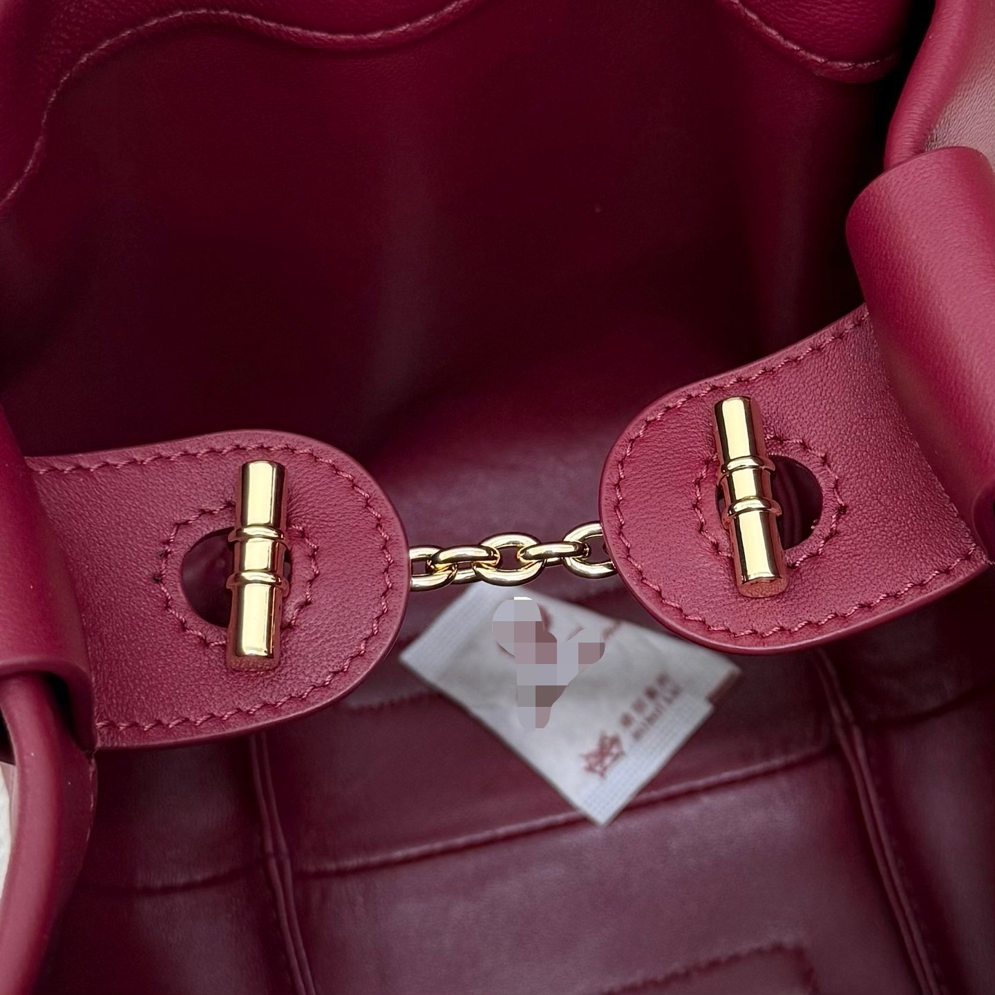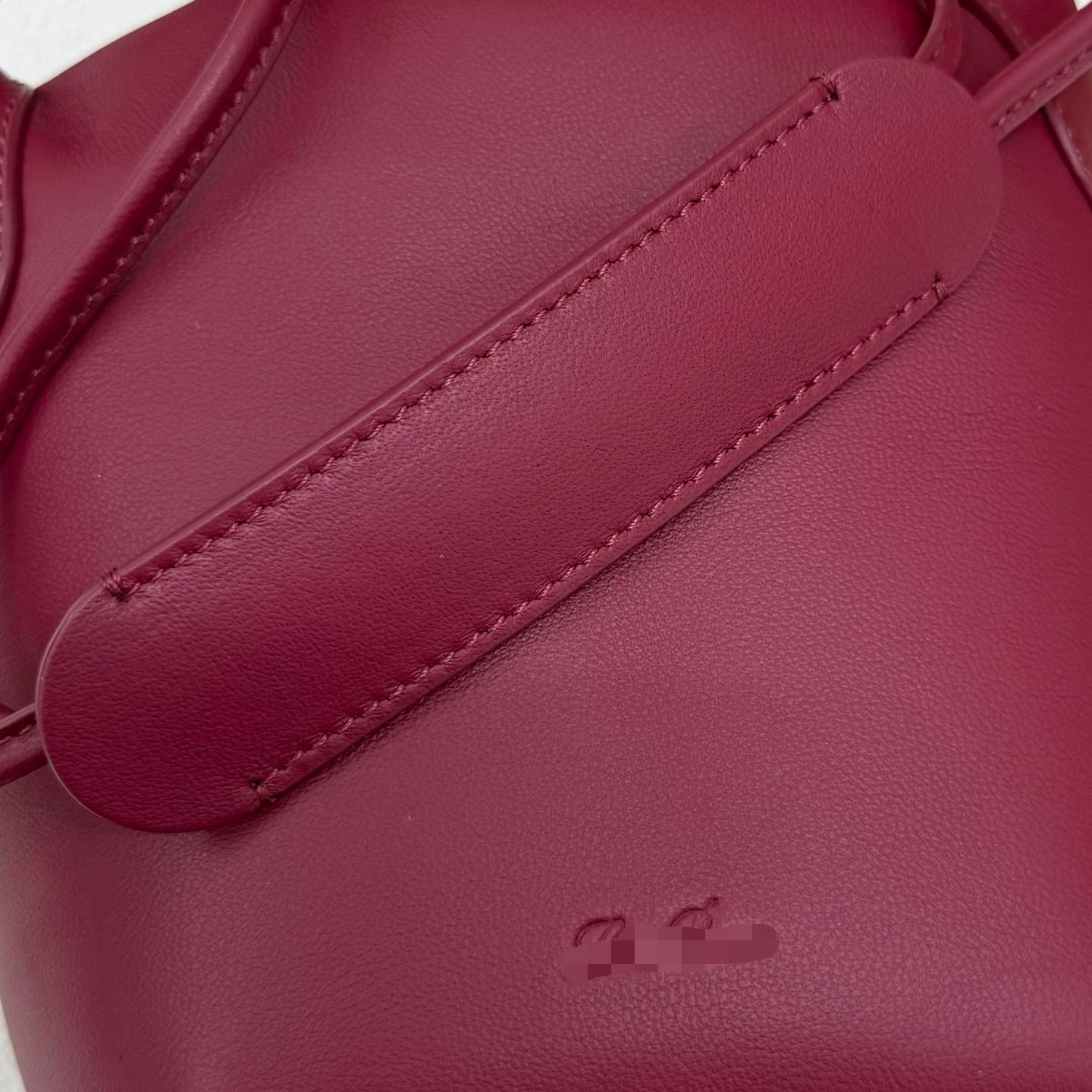 LP Bale Softy抽繩水桶包 款號:FAQ2160顏色:紅色羊皮Bail Softie是一款精緻的小號水桶包,配有手工縫製手柄,採用無縫設計,配有抽繩肩帶,可手提或斜挎。採用柔軟絲滑的羊皮革精心打造,表面呈現獨特的粒面質感。內部金屬扣環,內部皮革小袋,帶扣環,金屬色飾面配件,正面壓印同色系徽標,皮革底座。羊皮內裏 size:15 * 12.5 * 17CM