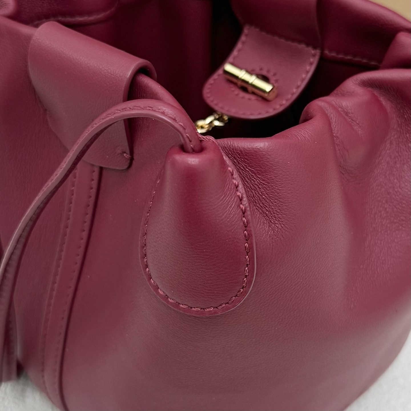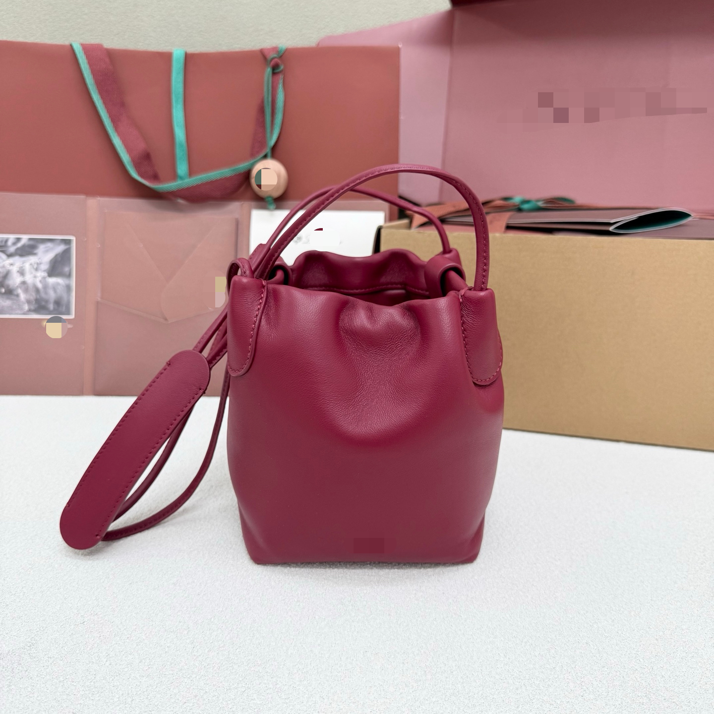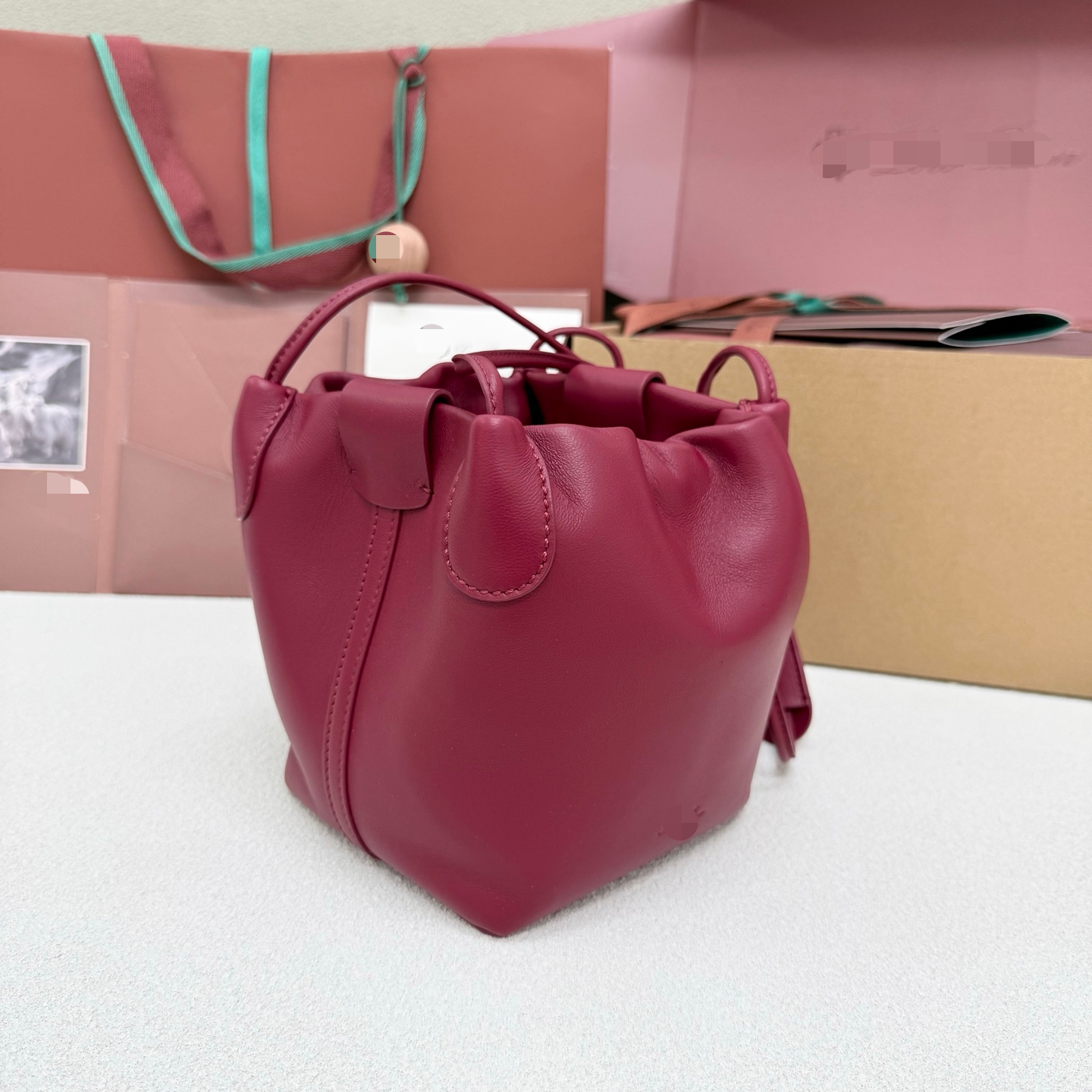 LP Bale Softy抽繩水桶包 款號:FAQ2160顏色:紅色羊皮Bail Softie是一款精緻的小號水桶包,配有手工縫製手柄,採用無縫設計,配有抽繩肩帶,可手提或斜挎。採用柔軟絲滑的羊皮革精心打造,表面呈現獨特的粒面質感。內部金屬扣環,內部皮革小袋,帶扣環,金屬色飾面配件,正面壓印同色系徽標,皮革底座。羊皮內裏 size:15 * 12.5 * 17CM
